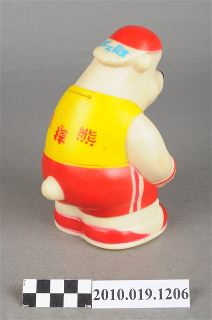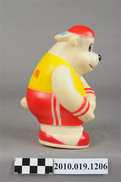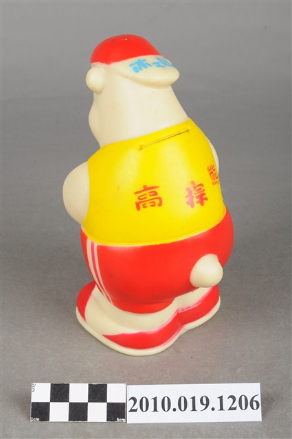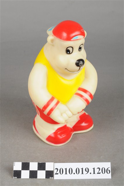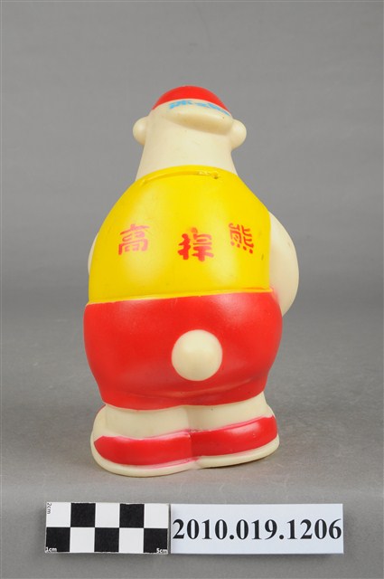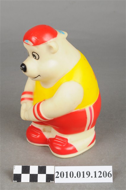 本物件為冰之鄉高捍熊玩偶,為北極熊的造型,白色身體,頭上戴著紅色帽子,身著黃色上衣、紅色褲、腳踩紅色球鞋。背面有投幣孔,頭上帽子的帽緣寫有「冰之鄉」,衣服寫有「高捍熊」,底部為有設計將錢幣取出之圓形口。