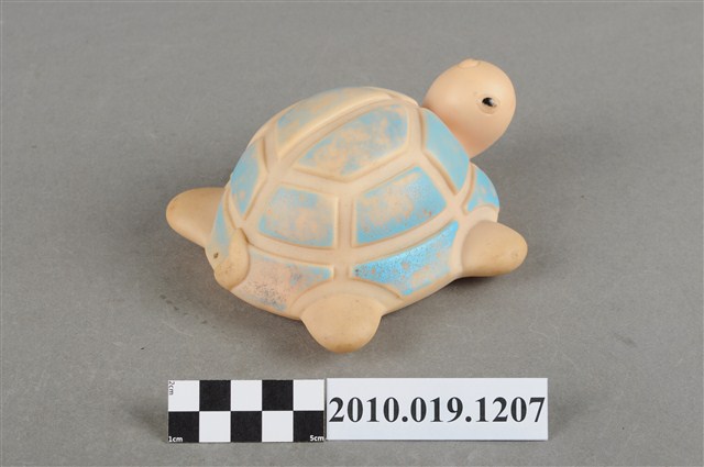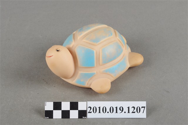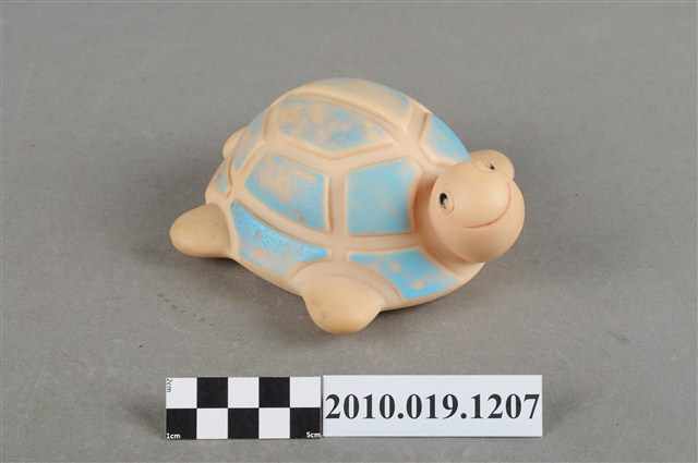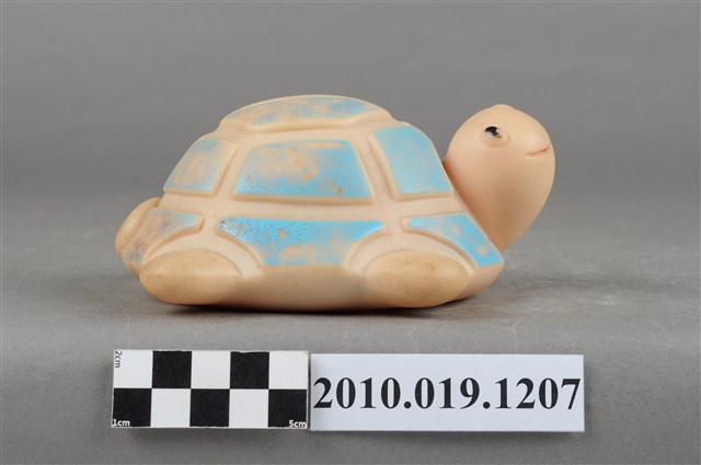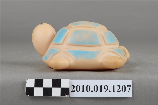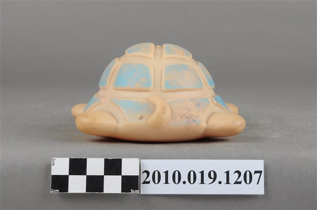 1.本物件為佳格嬰兒麥粉敬贈烏龜玩具,為膚色的烏龜造型,龜殼為淡藍色,些微掉漆。烏龜腹部寫有「桂格嬰兒麥粉發贈」、「ST玩具」的字樣。
