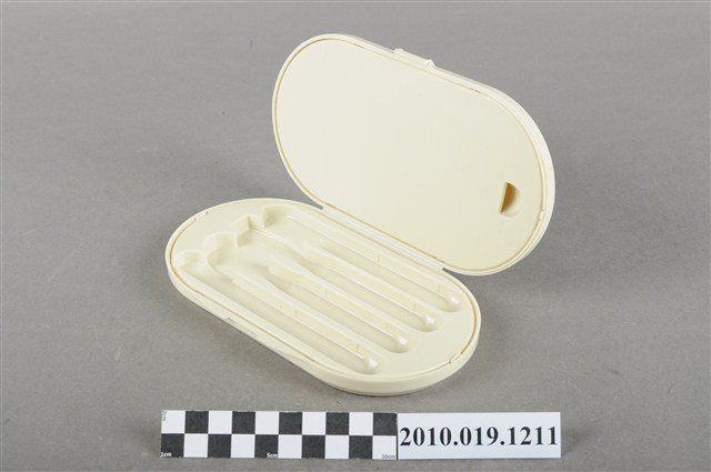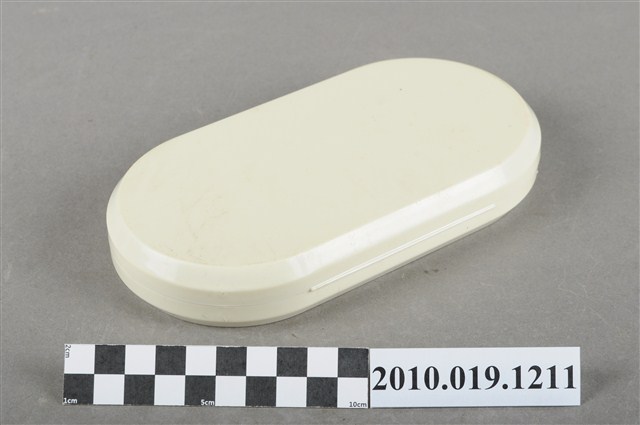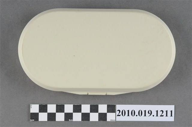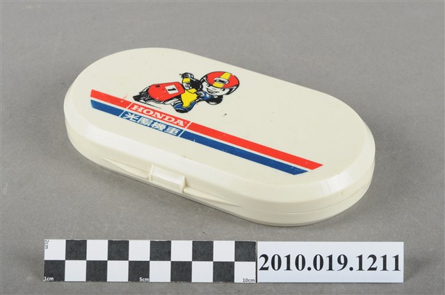 1.本物件為HONDA光陽機車餐具盒,為白色橢圓柱體。盒蓋上印有「HONDA」、「光陽機車」的字樣,還有男孩騎機車的正在壓車的圖樣。男孩頭上戴著安全帽,上頭寫有「omi」,機車車頭也有編號「1」。盒內有四個凹槽,可以放餐具。
