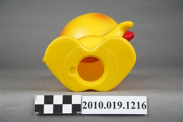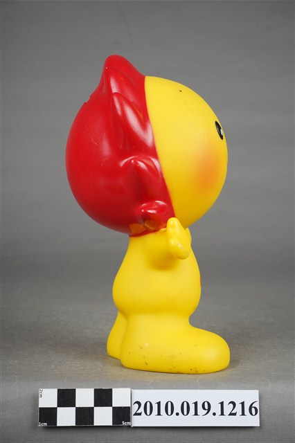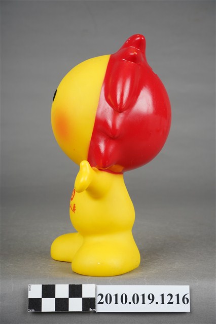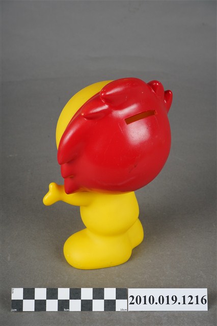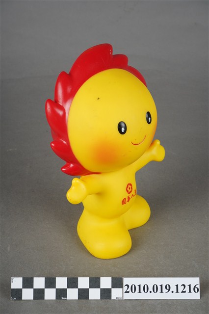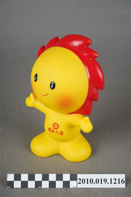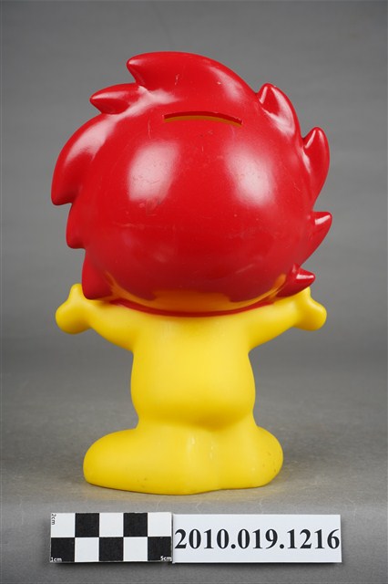 1.本物件為國華人壽小太陽公仔存錢筒,材質為塑膠。小太陽本體為黃色搭配紅色日冕作為頭髮,上方有一長方形孔洞可投零錢,以擬人姿態張開雙臂站立,面部呈微笑表情配以紅色腮紅,身體印有「國華人壽」及其logo。底部中心有一個洞,應為取出零錢處,洞口旁有「©KHL-08-06」字樣。