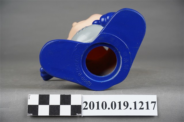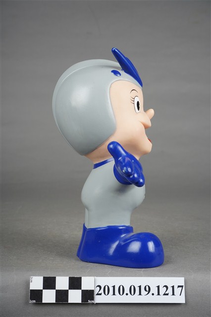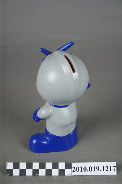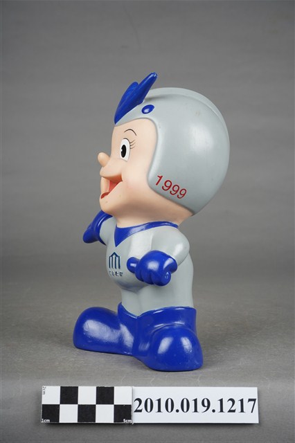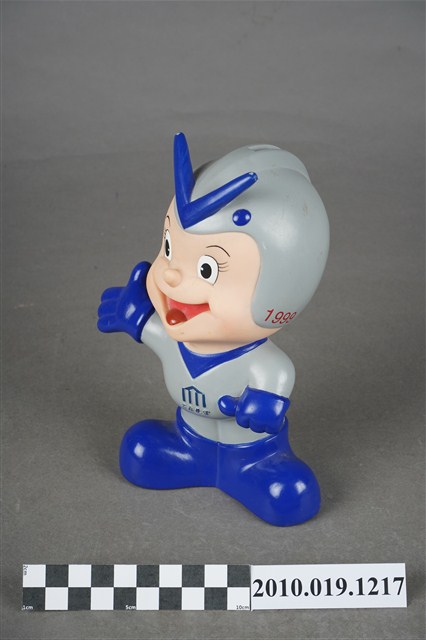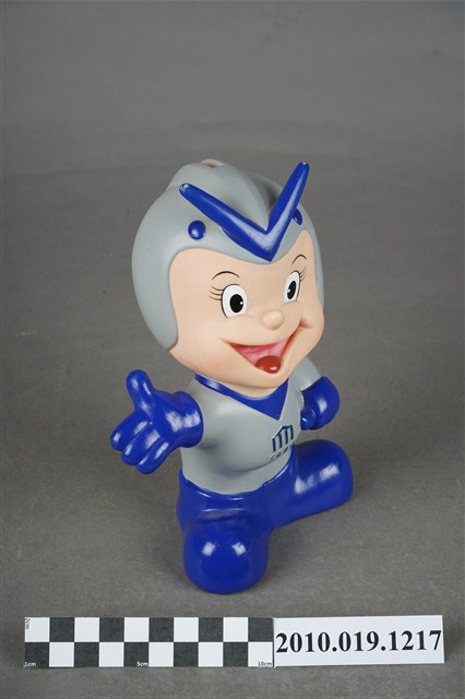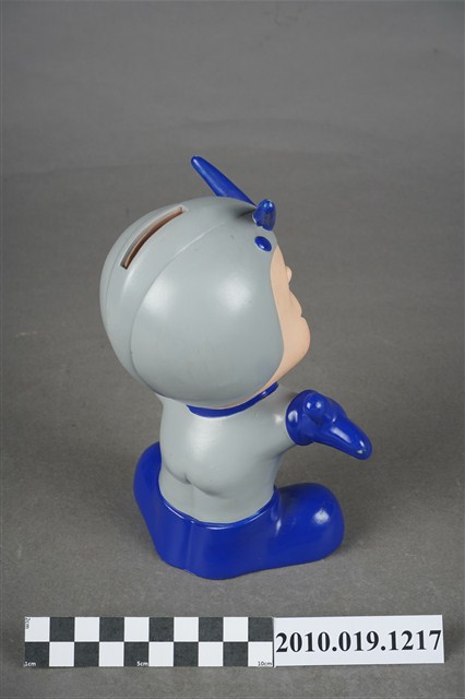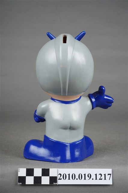 1.本物件為富鼎投信玩偶存錢筒,材質為塑膠。呈現單手高舉站姿,頭戴灰色頭盔前有藍色V型標誌,頭頂上方有一長方形孔洞可投零錢,側面有「1999」字樣,身著灰色衣服配藍色手套,前胸印有「富鼎投信」字樣及其logo,腳穿藍色鞋子。底部中心有一孔洞,應為取出零錢處,洞口旁有「嵩灃公司承制」、「(02)2570-0065」字樣。