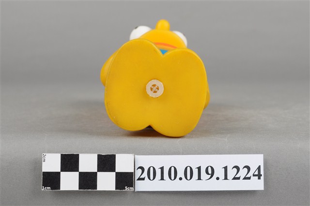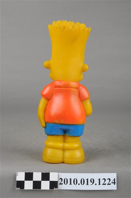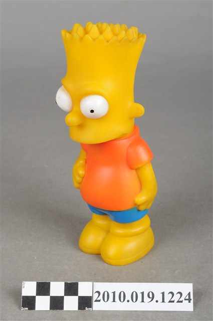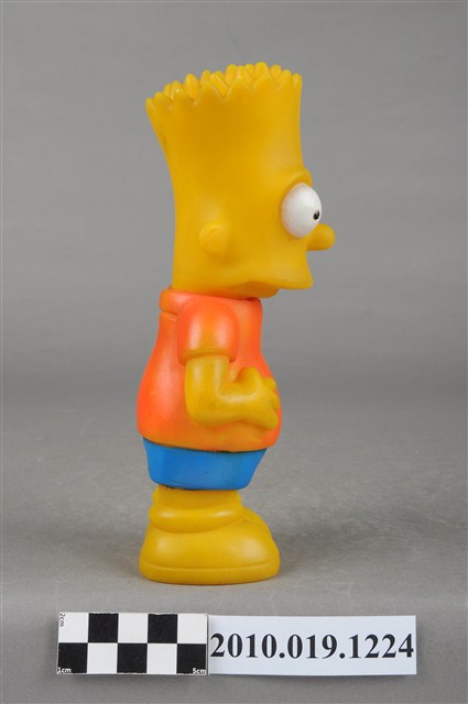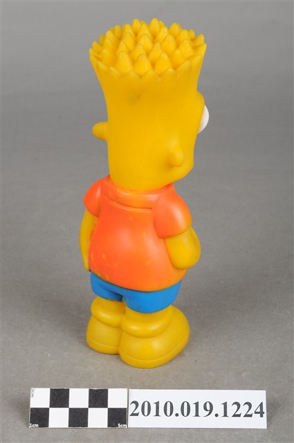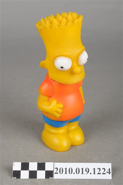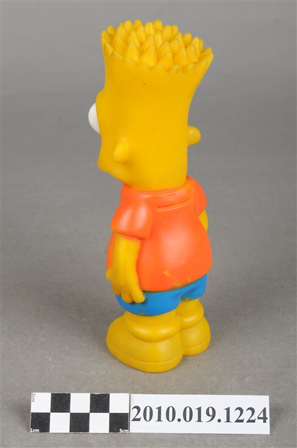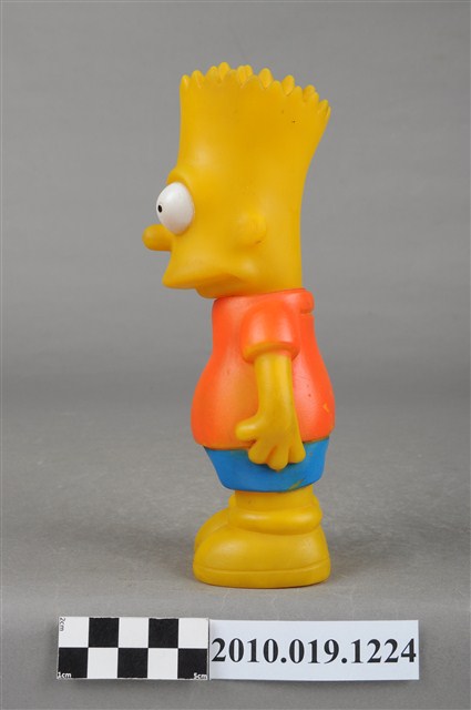 1.本物件為辛普森家庭霸子玩偶,霸子的身體為黃色,身著橘色短袖衣服,藍色短褲、黃色鞋。右手摸著肚子,左手貼齊右側臀部。