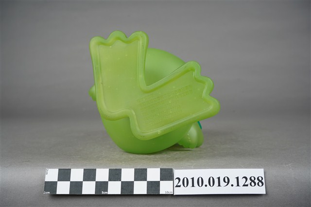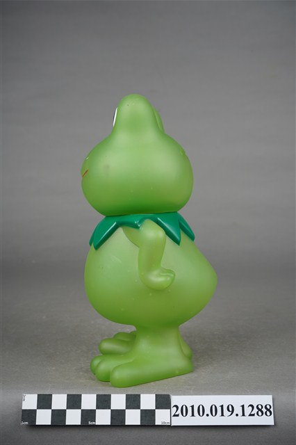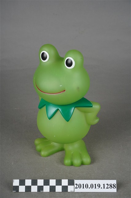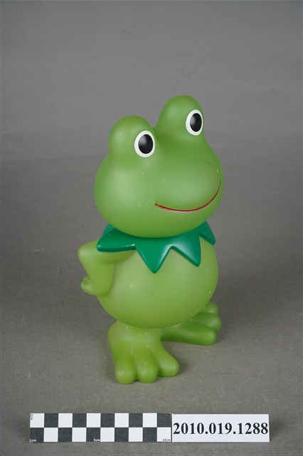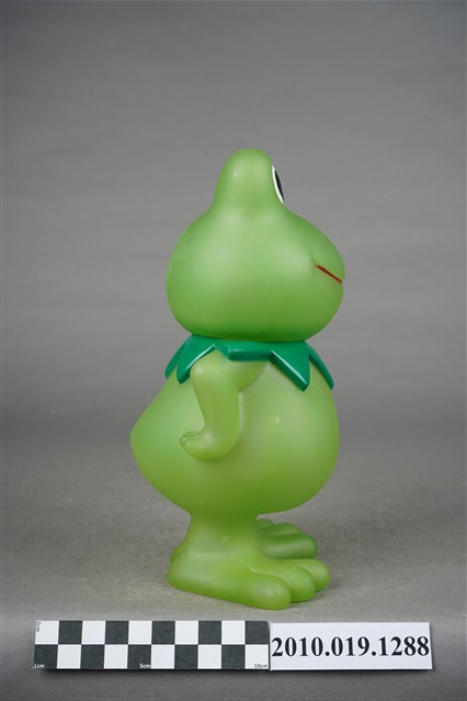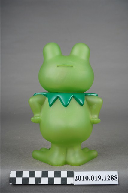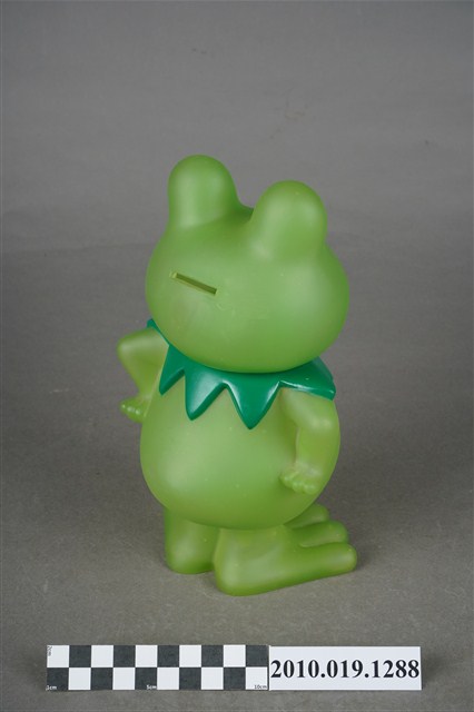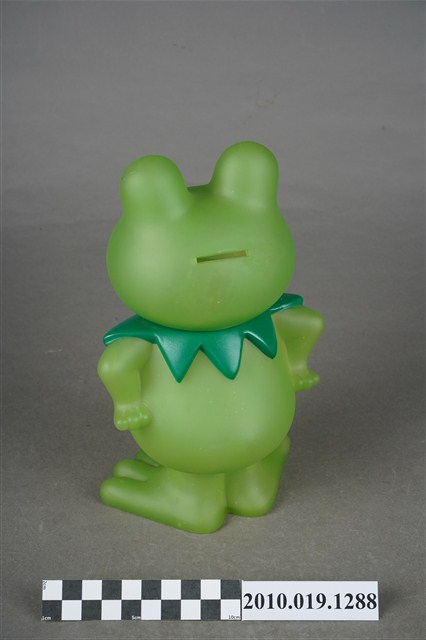 本物件為綠青蛙玩偶存錢筒,材質為塑膠。綠青蛙脖子配戴深綠色領巾,以擬人姿態雙手叉腰站立,在頭後方有一長方形孔洞可投零錢。底部有「授權製造商:英列(深圳立昌錦慶塑膠五金玩具廠)」、「中國深圳市龍華鎮赤嶺頭村工業區」、「TEL:86-755-8127757」、「FAX:86-755-8127759」、「臺北:886-2-27598578」字樣。