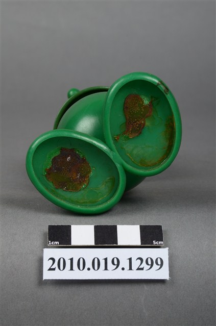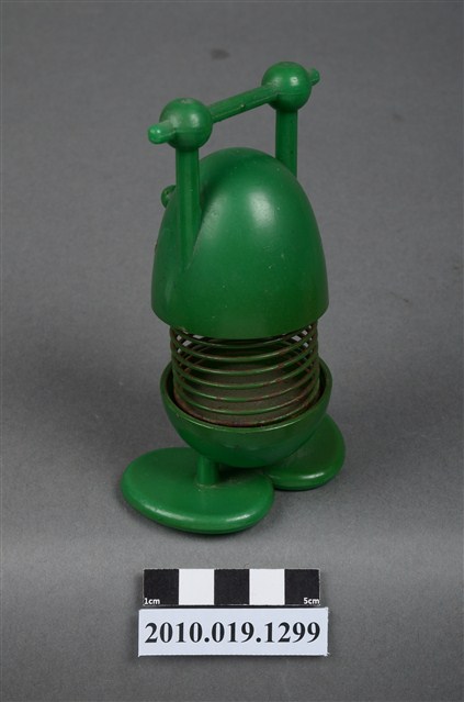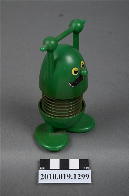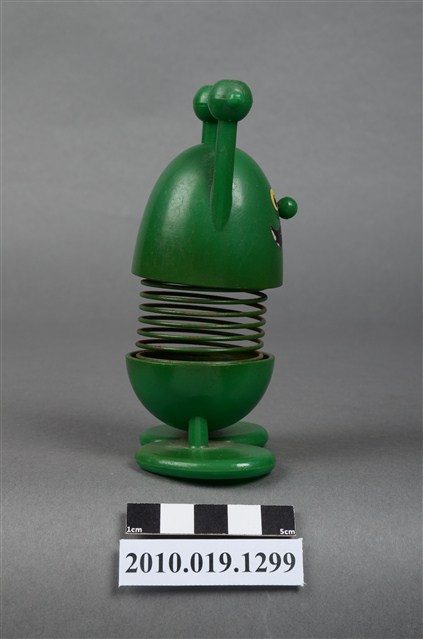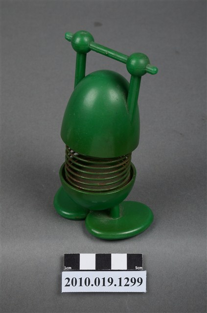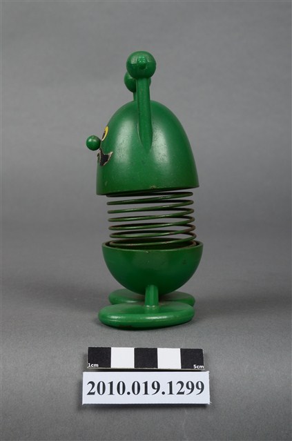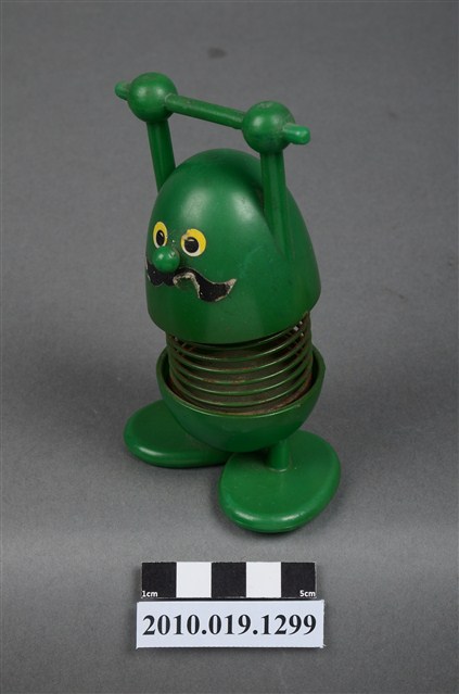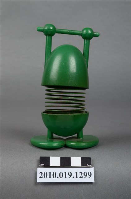 本物件為彈簧玩具,塑膠材質,中間彈簧部分為金屬。玩具為人的姿態,雙手貌似拉單槓,顏色為綠色。金屬彈簧已有鏽蝕現象。