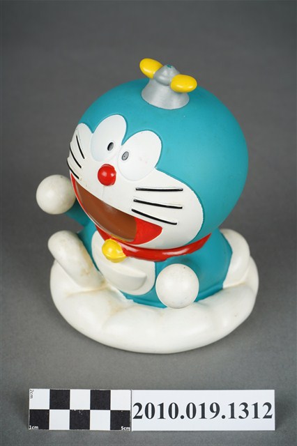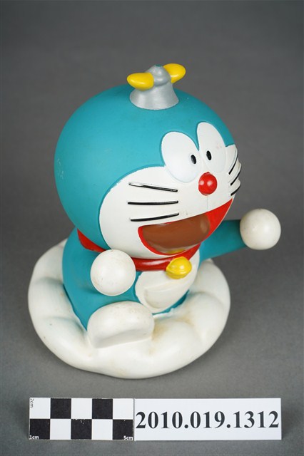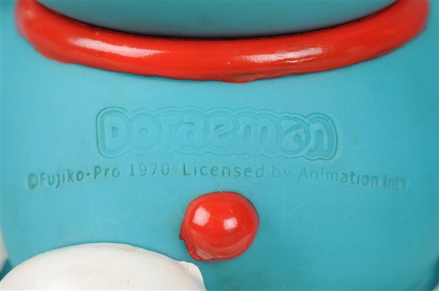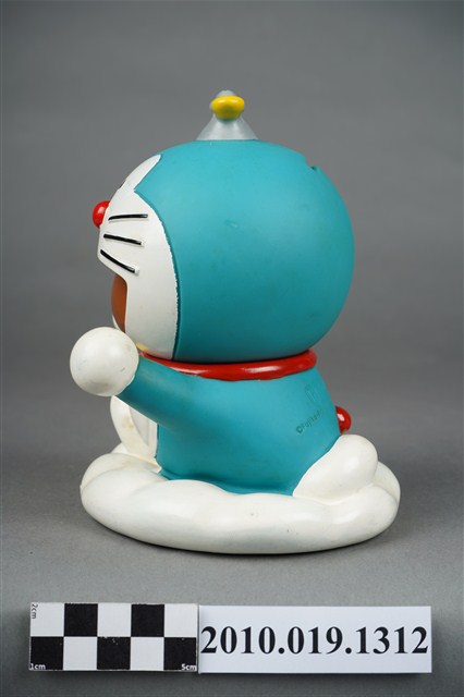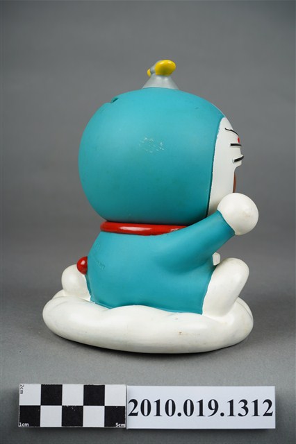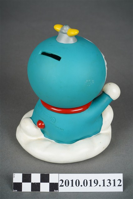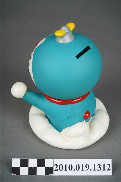 1.本物件為哆啦A夢頭戴竹蜻蜓造型存錢筒。背面有"Doraemon"註冊商標,底部有"Animation International"字樣的貼紙。