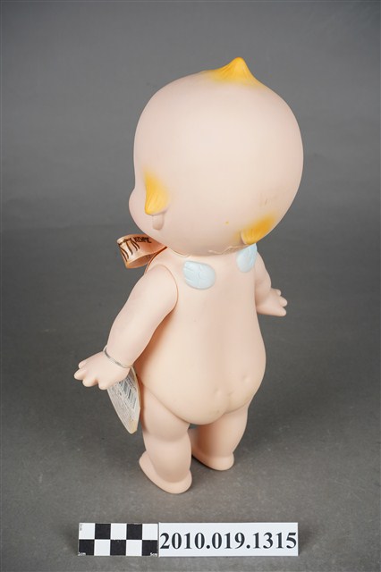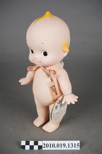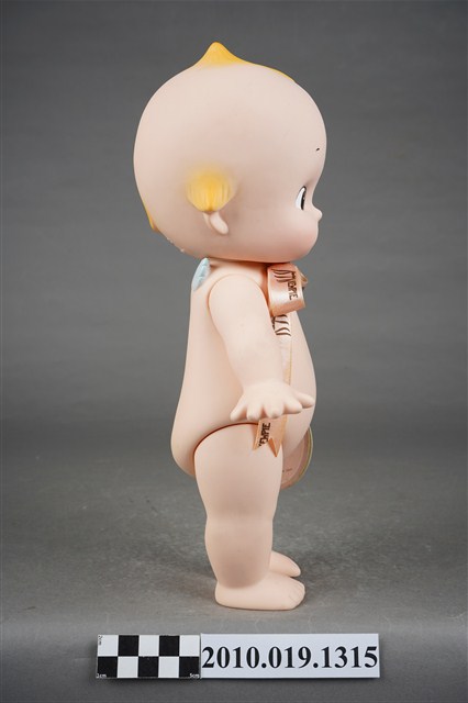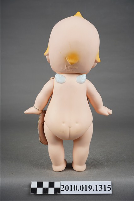 1.本物件為Q比娃娃,臉部有著長睫毛、黑色大眼睛,頭頂、耳朵兩側以及後腦有凸出的黃色頭髮樣貌,背後有著1對白色小翅膀。身上的蝴蝶結有創作者「Rose O'Neill」與「KEWPIE」字樣,後腦有「Rose O’Neill」、「KEWPIE」與「Rose O'Neill KEWPIE JAPAN」字樣。手上有一吊牌。