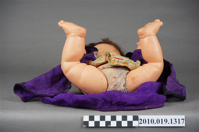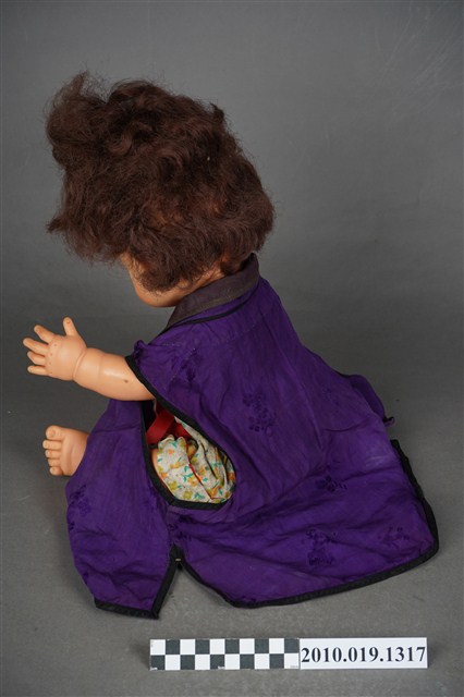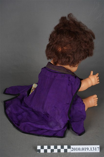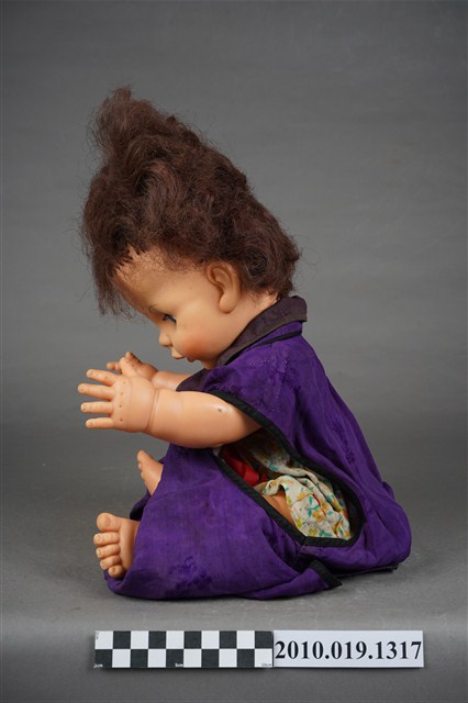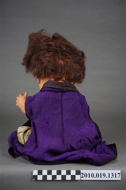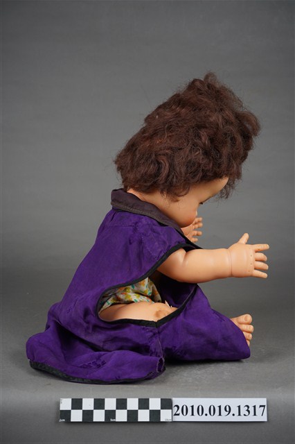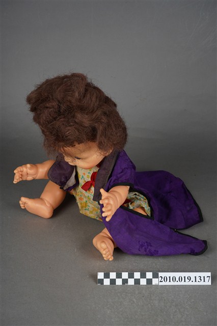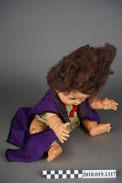 本物件為女嬰玩偶,塑膠材質,為坐姿。身穿黃色碎花洋裝、紫色無袖外套。玩偶的咖啡色頭髮雜亂,衣服有多處髒污及破損。