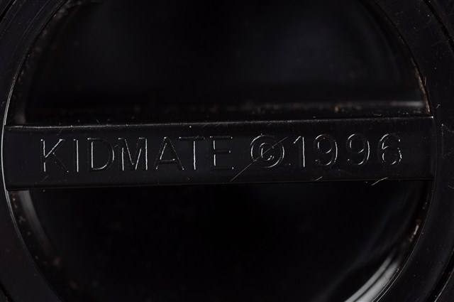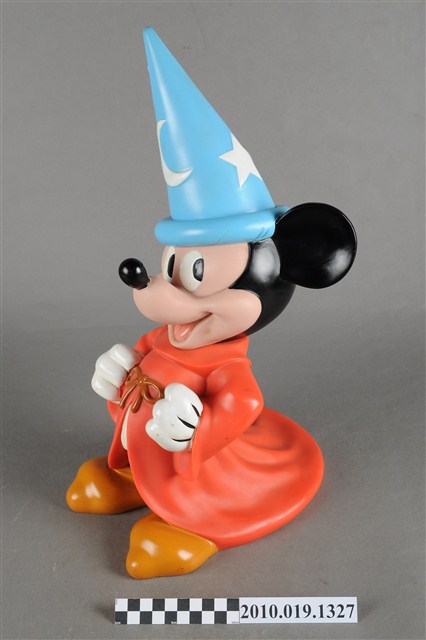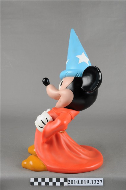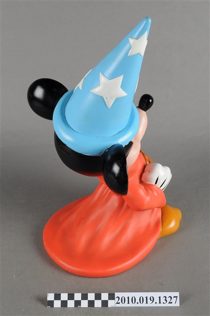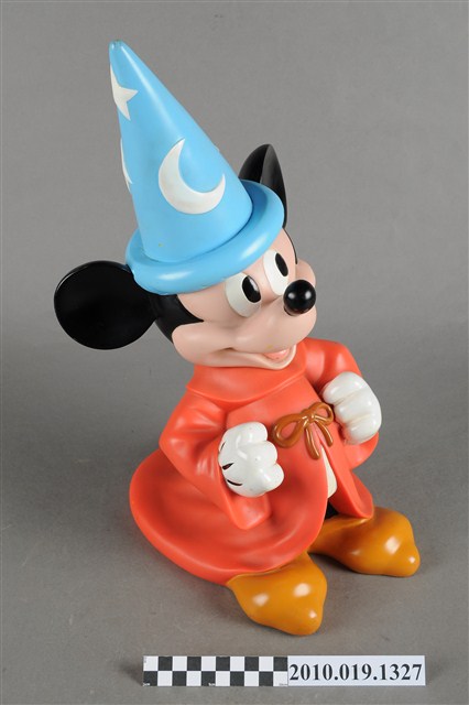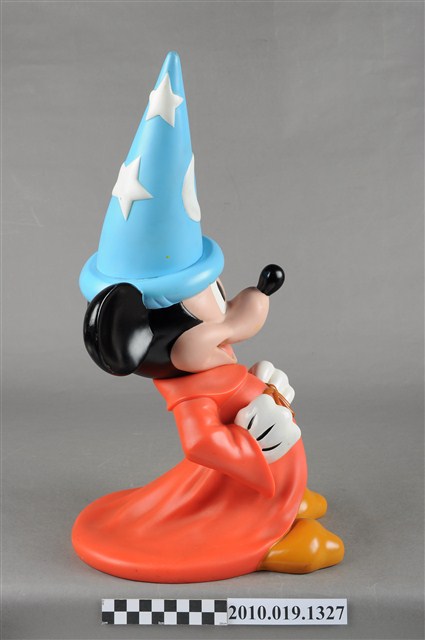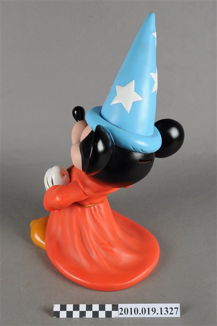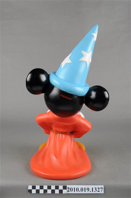 1.本物件為米老鼠頭戴淺藍色底、上有白色月亮與星星的巫師帽,身穿紅色長袍,穿著白色手套、黃色大鞋,呈現魔法師造型的存錢筒。底部取錢孔塞子上有「KIDMATE©1996」及打開方向標誌等字樣與符號。