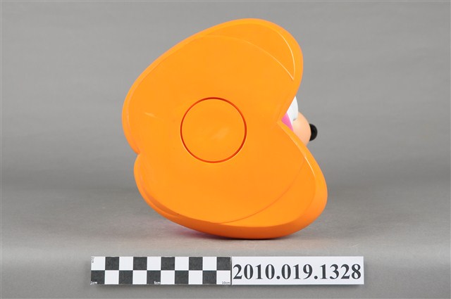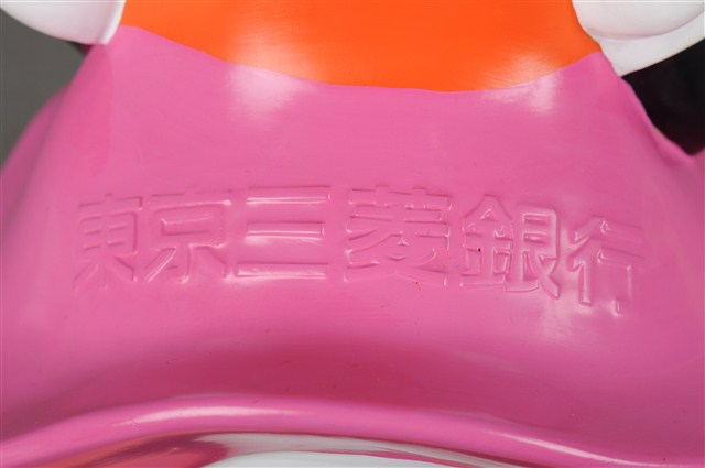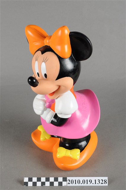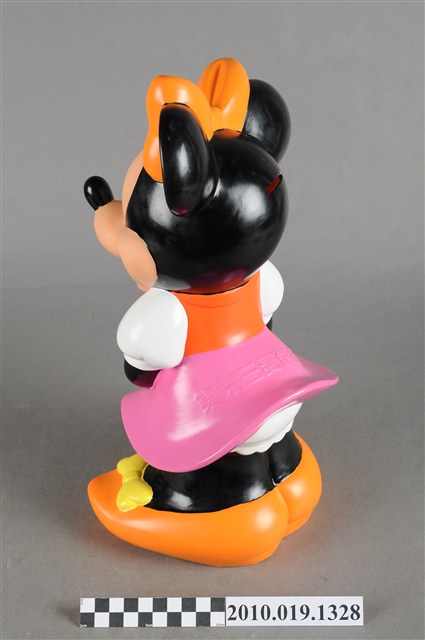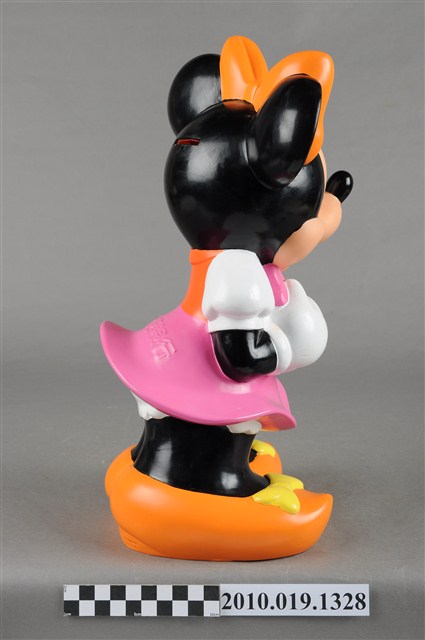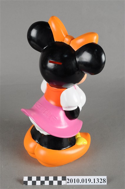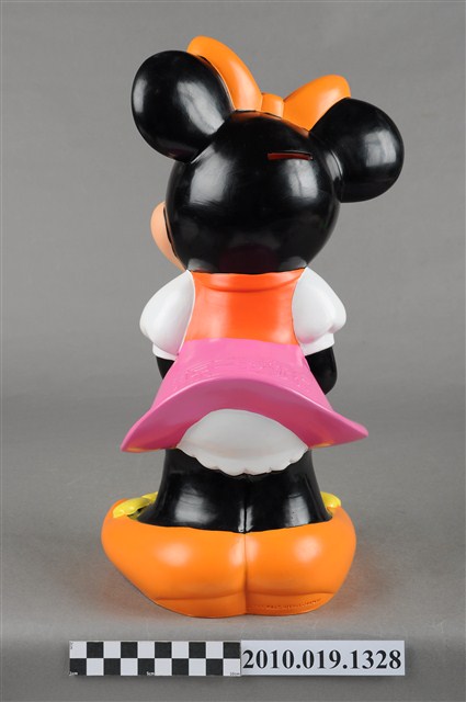1.本物件為東京三菱銀行米妮造型存錢筒,頭綁粉紅色蝴蝶結,身穿白色與粉紅色洋裝、黑色內襯,腳穿橘色、黃色蝴蝶結鞋子,手戴白色手套。洋裝背後有「東京三菱銀行」字樣。