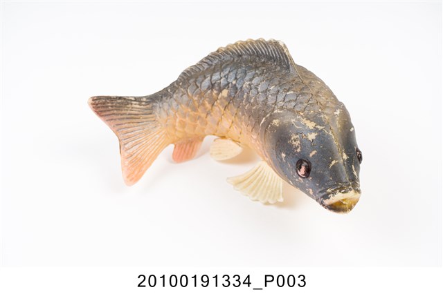 本物件為魚玩偶,塑膠材質。顏色為黑與黃色漸層相間,整體的黑色顏料塗裝已有剝落狀況,魚身的魚鱗雕刻分明。