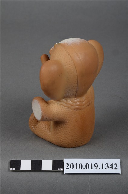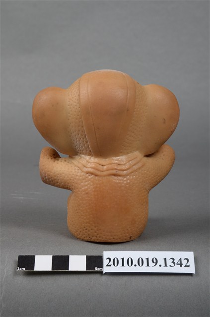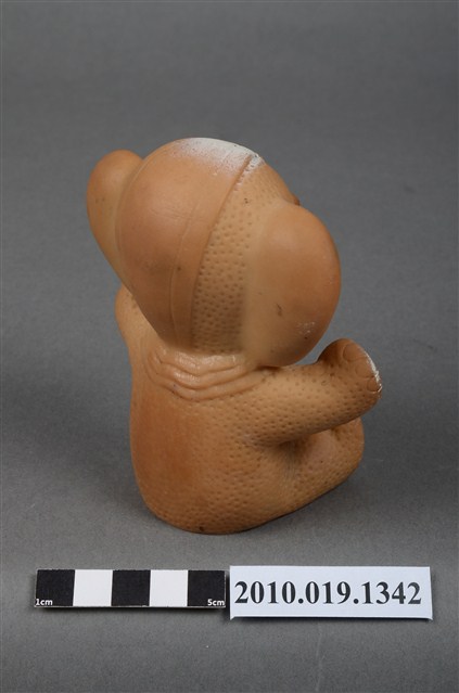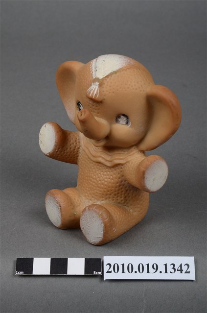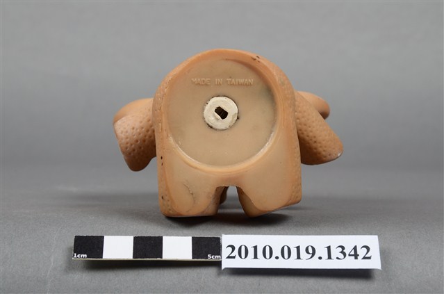 本物件為象玩偶,塑膠材質,坐姿。整體顏色為咖啡色,眼睛、頭頂與四肢的平面處有黑或白色顏料塗裝。玩偶屁股底部有一圓孔,以及製造產地的英文字樣「MADE IN TAIWAN」。