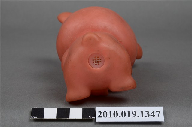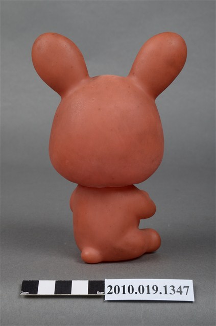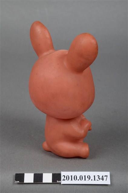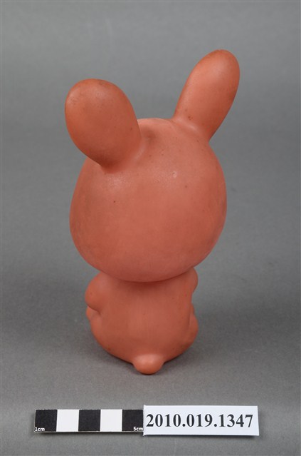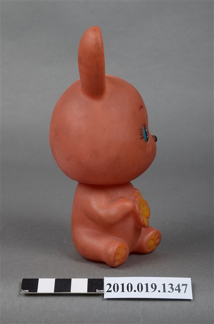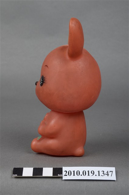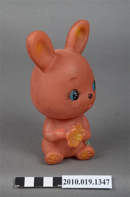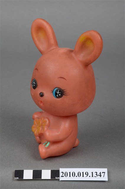 本物件為兔子玩偶,塑膠材質,坐姿。整體顏色為橘色,雙手拿著2朵小花。玩偶眼睛有黑、白與藍色顏料塗裝,底部有一網狀圓孔。