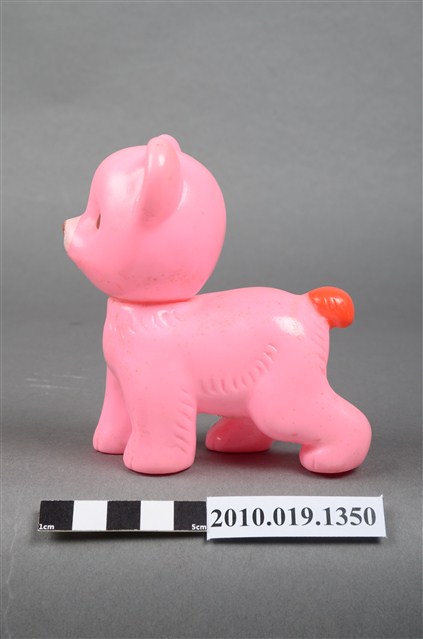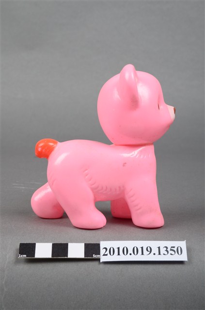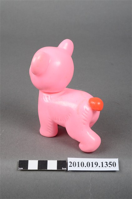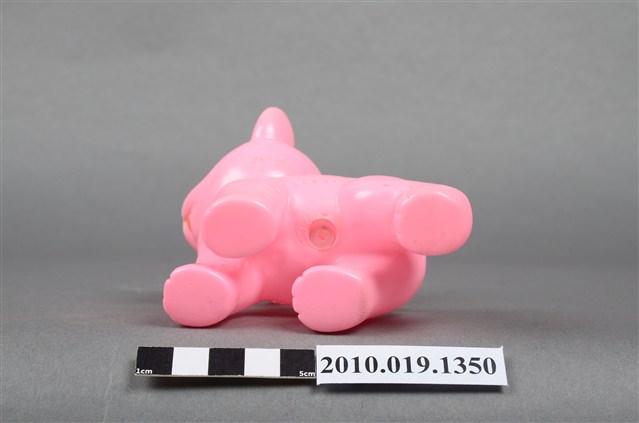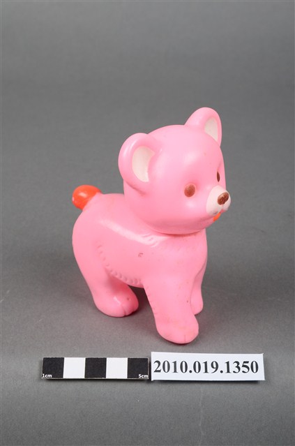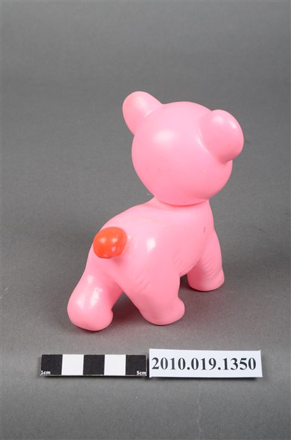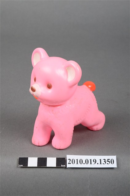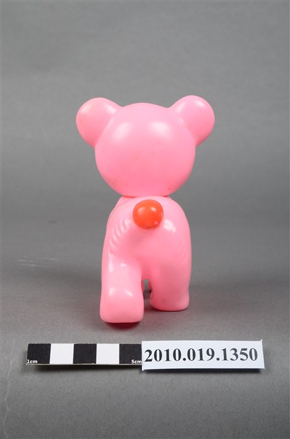 本物件為小熊玩偶,塑膠材質,主要顏色為粉紅色,眼睛與鼻子為咖啡色,耳朵與鼻子周邊為白色,嘴巴與尾巴為紅色。玩偶腹部處有一圓孔,圓孔周邊有應為英文的字樣。本物件表面上有許多髒污。