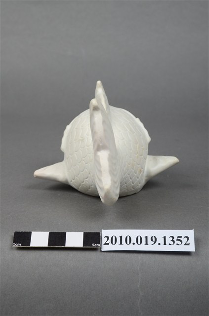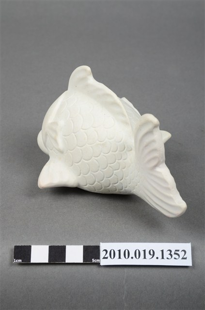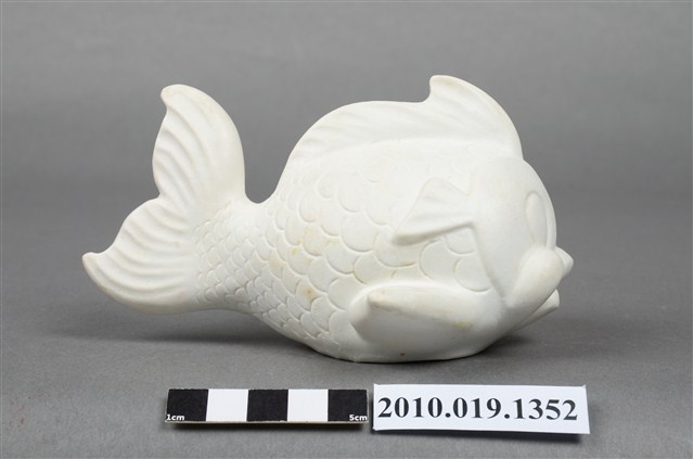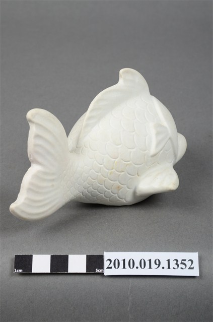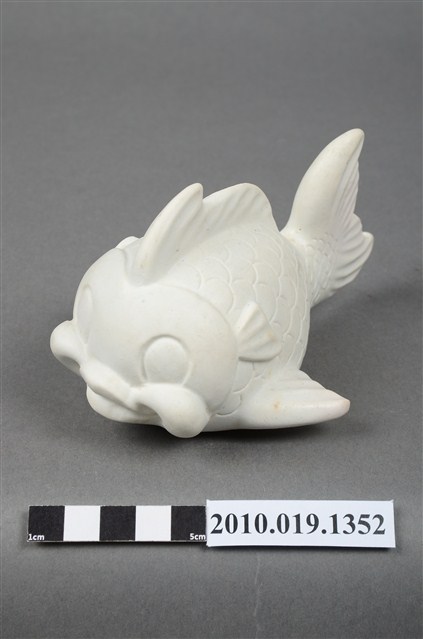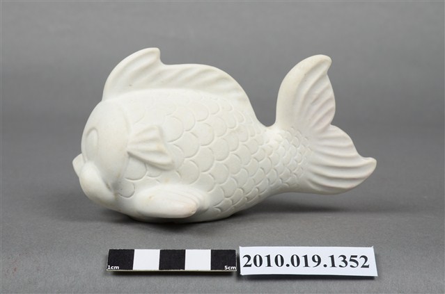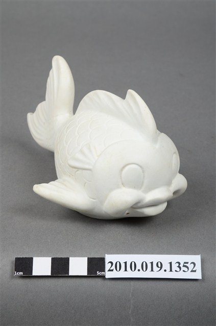 本物件為魚玩偶,應為陶製,顏色為白色。玩偶身上有魚鱗花紋,腹部處有一圓孔,周圍有「MADE IN TAIWAN」字樣。本物件表面上有許多髒污。