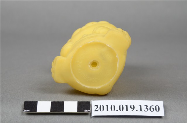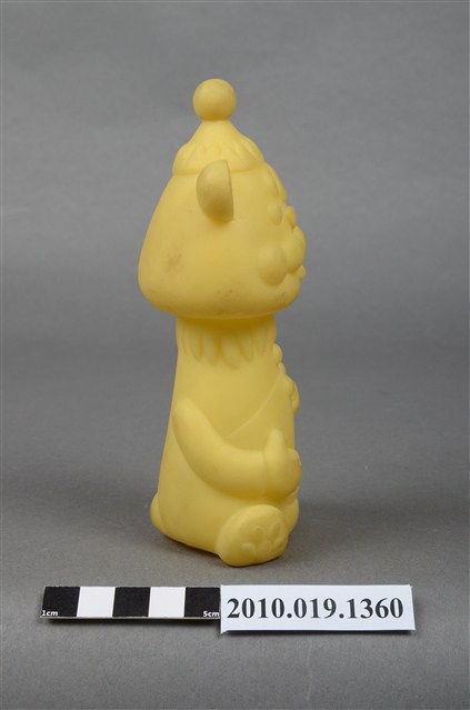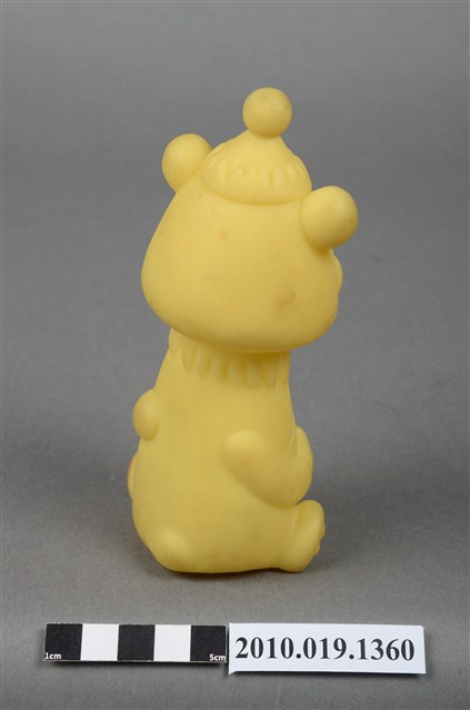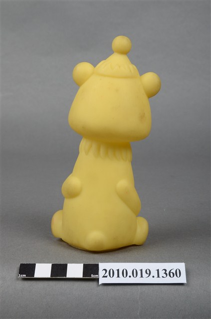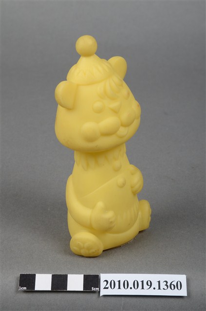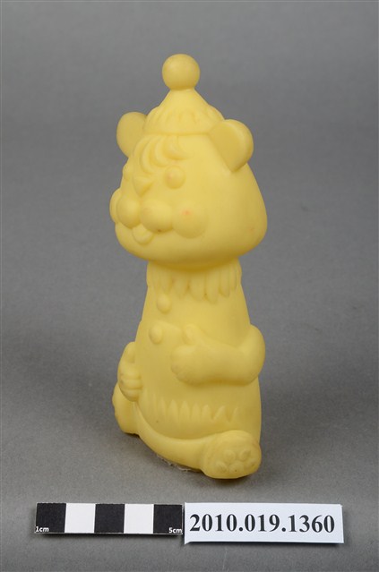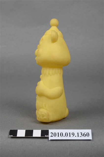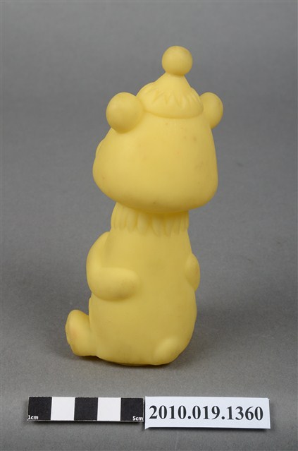 本物件為玩偶,塑膠材質,呈坐姿。玩偶顏色為黃色,頭戴帽子,無法辨視其為何種動物。玩偶底部有一圓孔,周圍有英文字樣。本物件表面上有許多髒污。