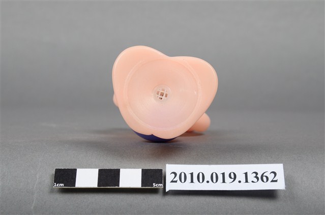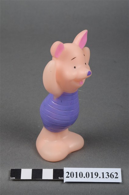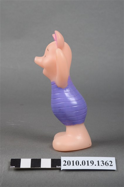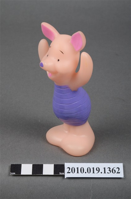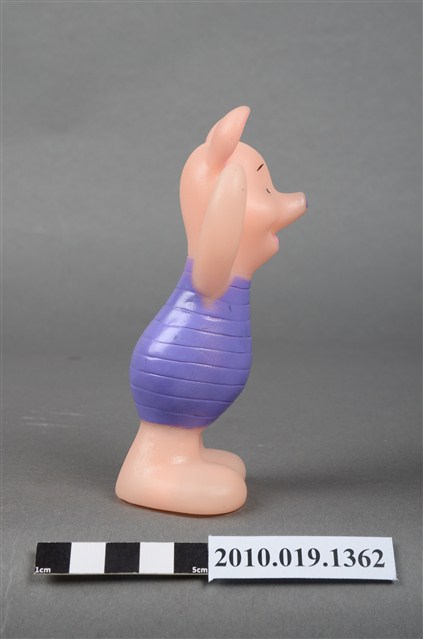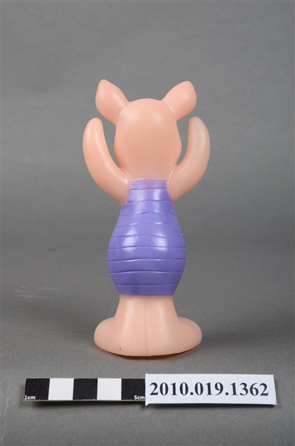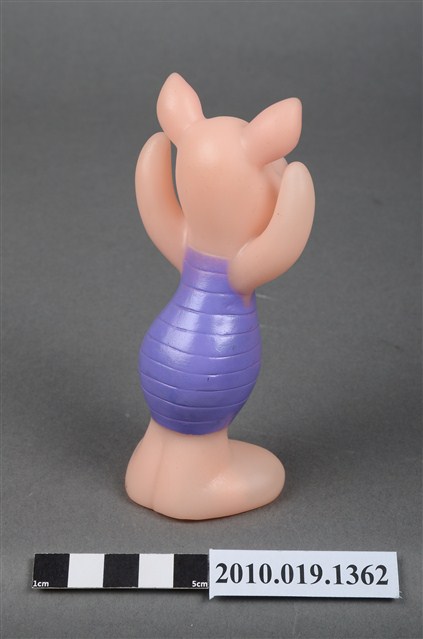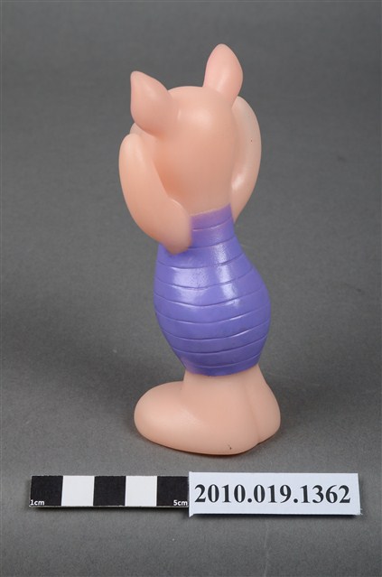 1.本物件為小豬玩偶,塑膠材質,呈高舉雙手向上姿態。玩偶顏色為粉紅色,其紫色服裝有多條線條,眉毛、眼睛為黑色,耳朵、嘴巴為粉紅色,鼻子為紫色。玩偶底部有一網狀圓孔,本物件表面上有明顯髒污。