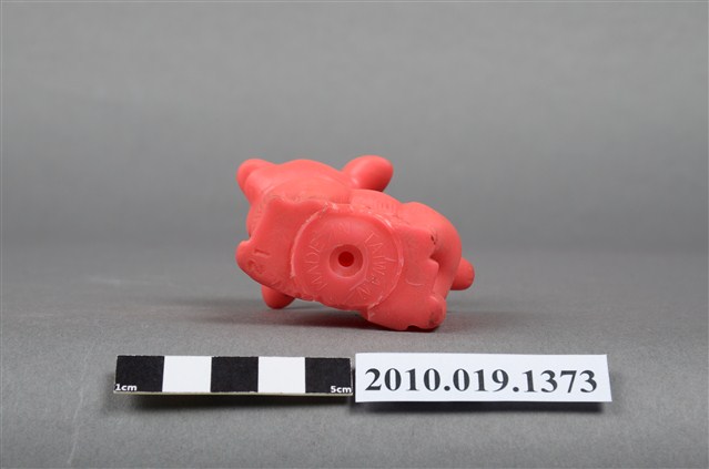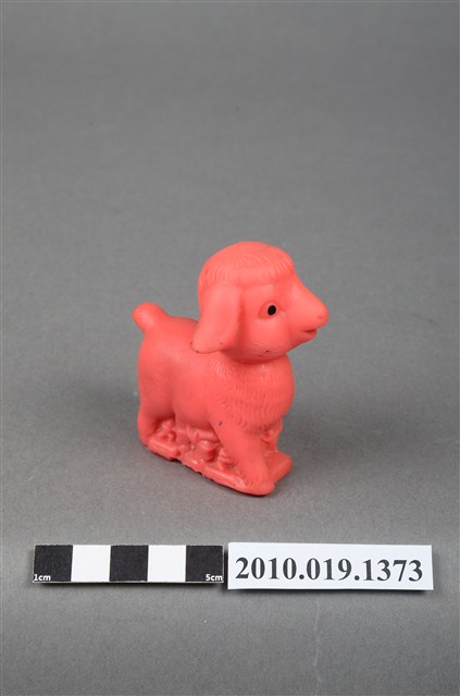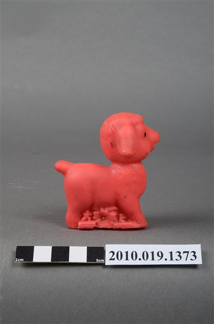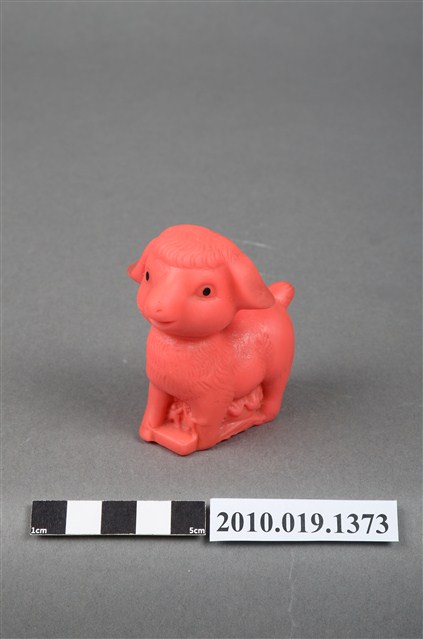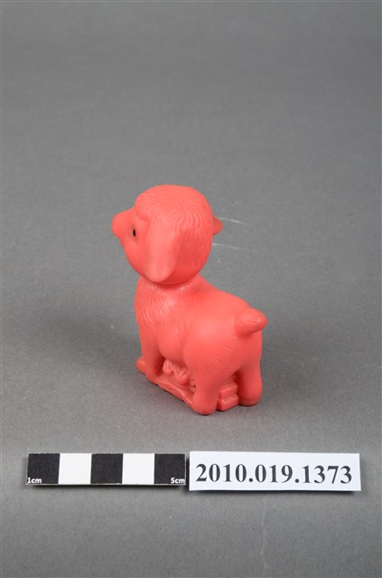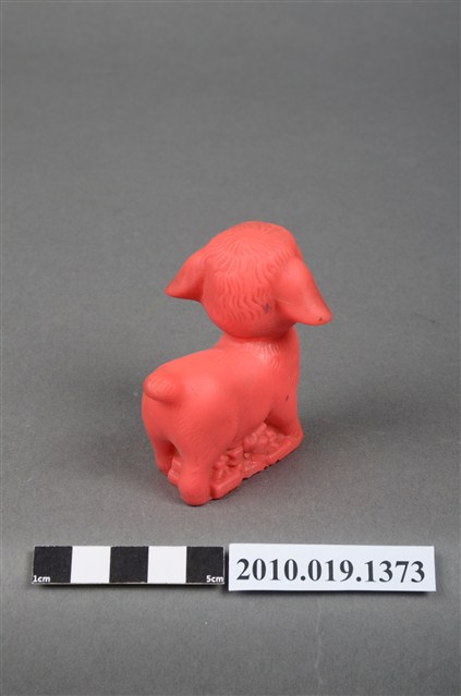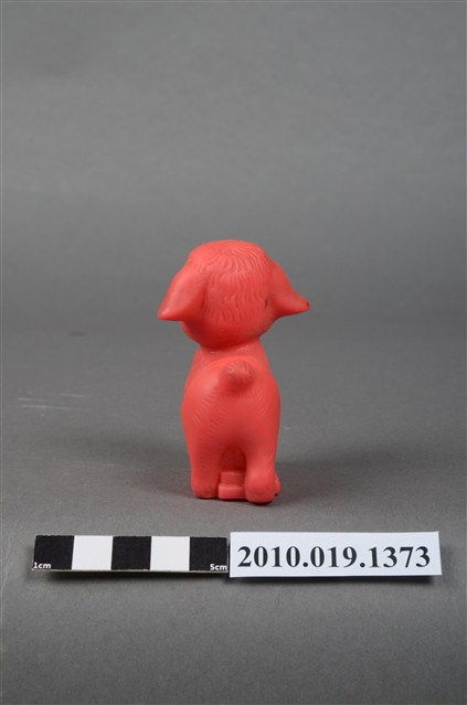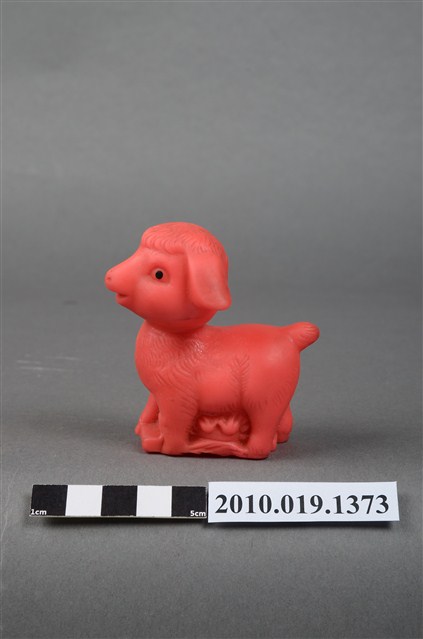 本物件為綿羊玩偶,塑膠材質。玩偶顏色為紅色,眼睛有黑色顏料塗裝。本物件表面上有許多髒污。