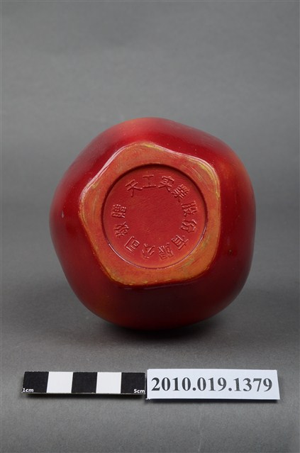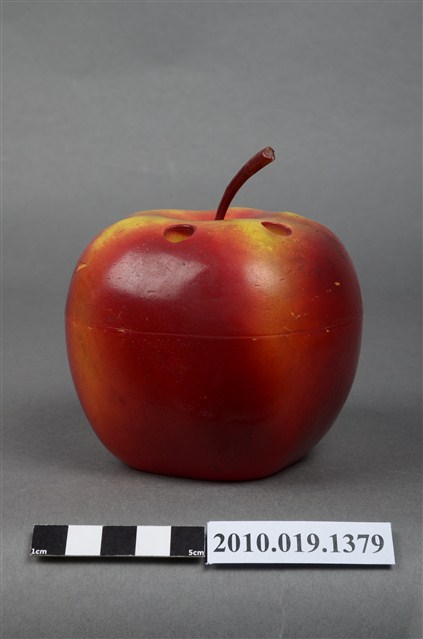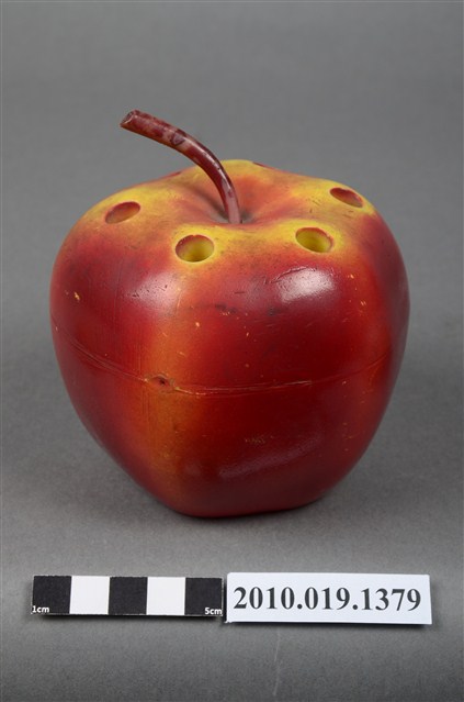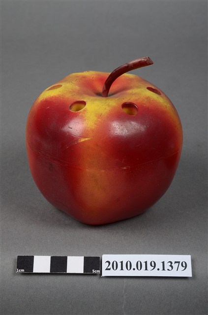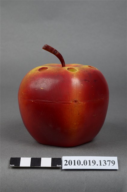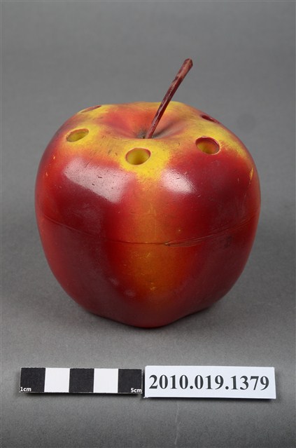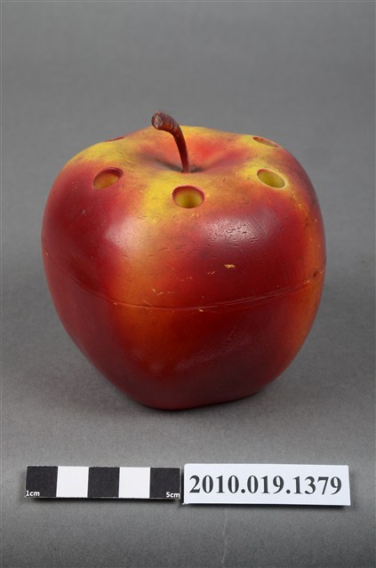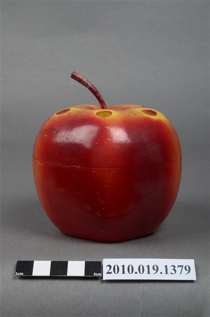 本物件為天工實業股份有限公司蘋果造型筆筒,塑膠材質。蘋果造型筆筒顏色為紅色,上頭有咖啡色果柄,並有多個孔洞作為放置筆之用途,筆筒底部有「天工实業股份有限公司敬贈」字樣。