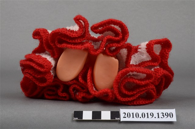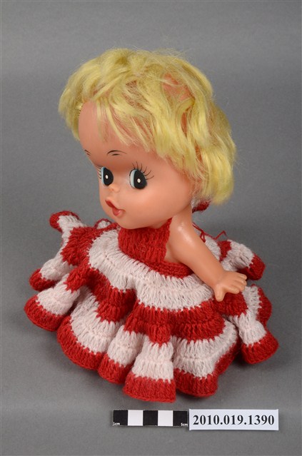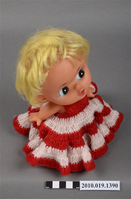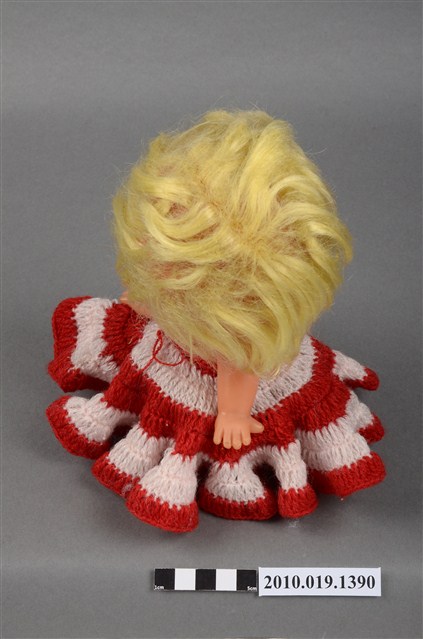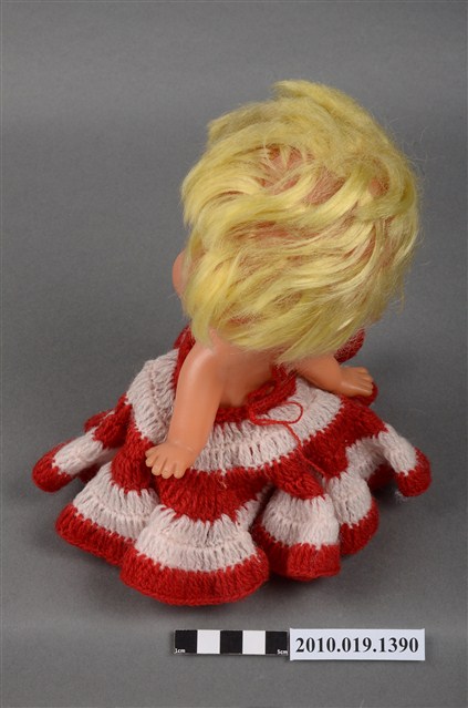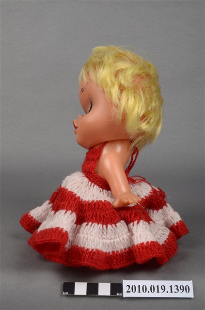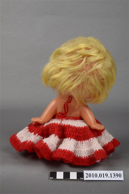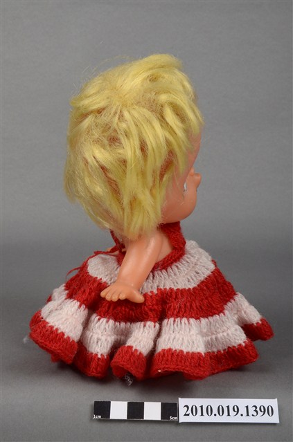本物件為女孩玩偶,塑膠材質。玩偶有著金黃色頭髮,身穿紅白相間條紋連身洋裝,眼睛有黑、白與藍色顏料塗裝,嘴巴嘟起,雙手的部分手指為翹起狀態。本物件表面上有許多髒污。