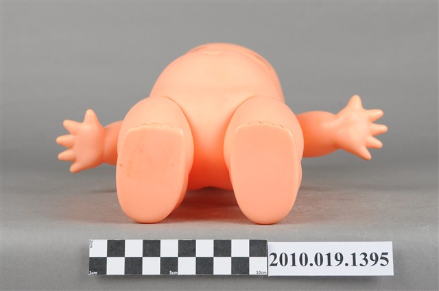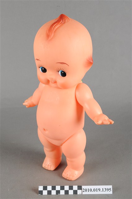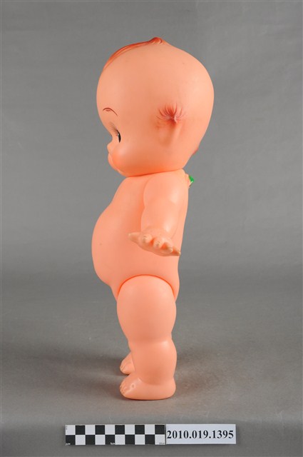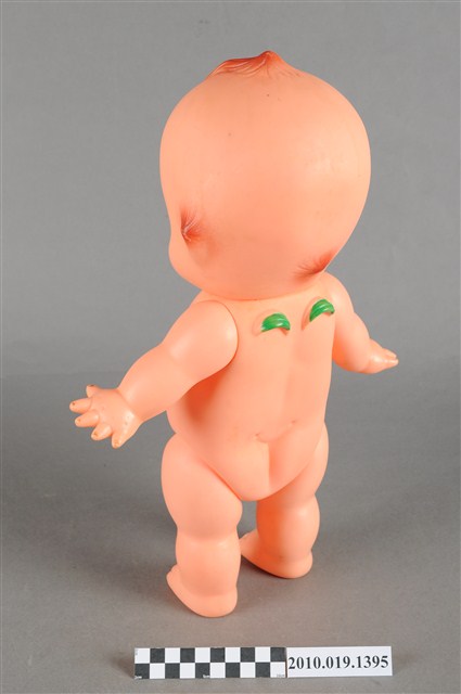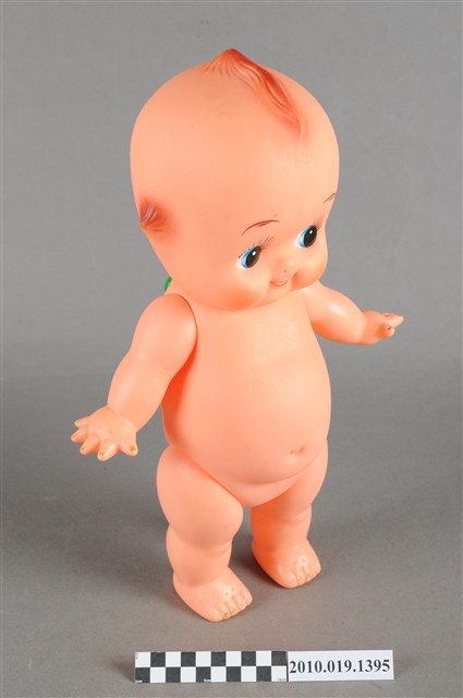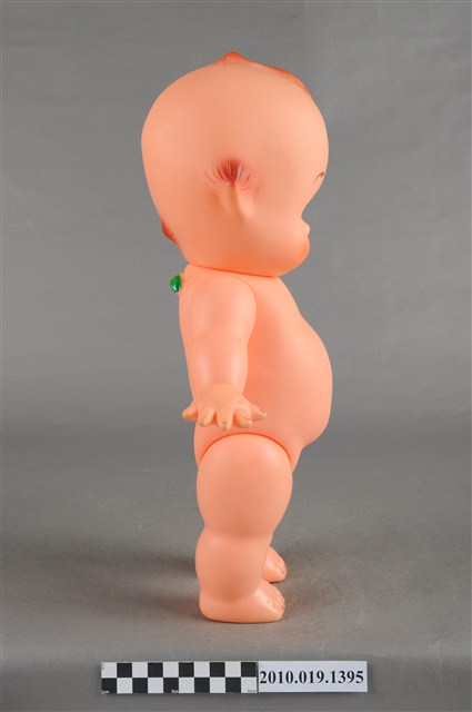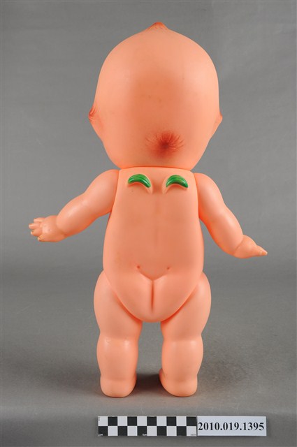 1.本物件為丘比娃娃,塑膠材質。玩偶臉部有著長睫毛,眼睛有白、黑與藍色顏料塗裝,頭頂、耳朵兩側以及後腦有凸出的頭髮,背後有綠色顏料塗裝的小翅膀。本物件表面上有許多髒污。