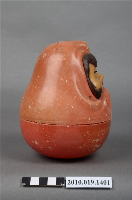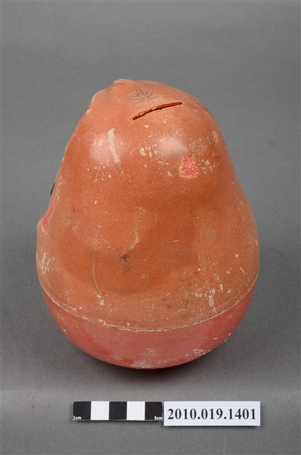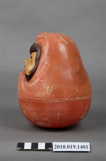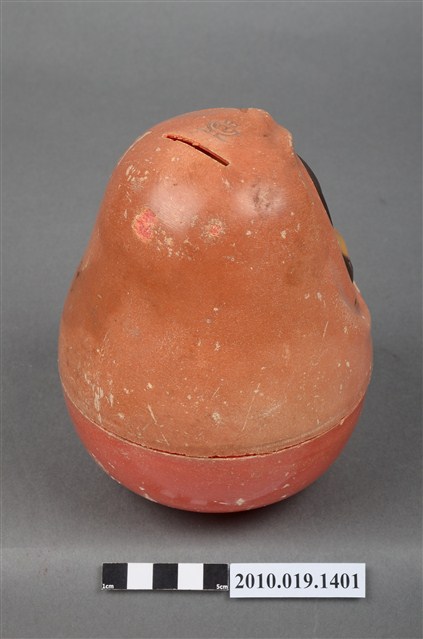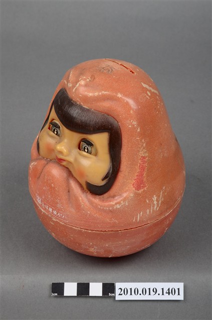 1.本物件為小林眼鏡不倒翁造型存錢筒,紅色、女孩造型的塑膠不倒翁存錢筒。正面衣服上有「小林眼鏡公司」字樣。