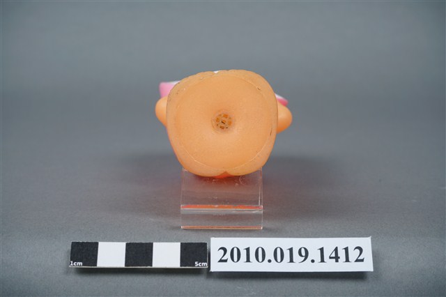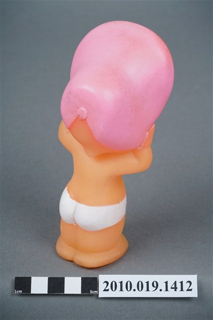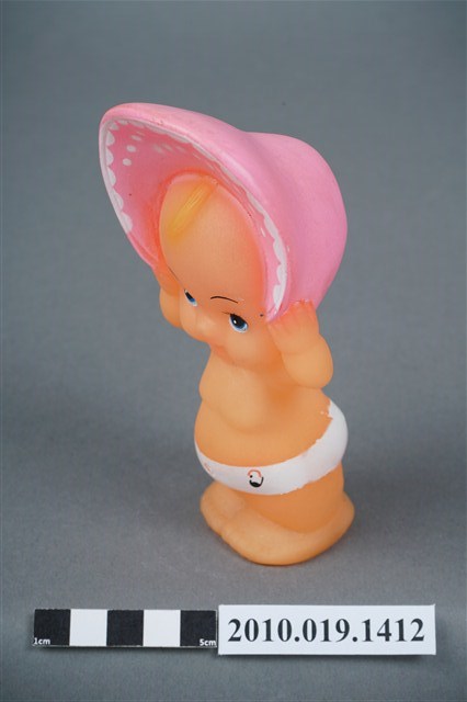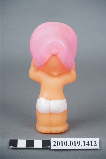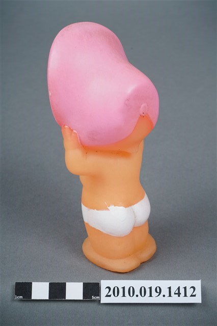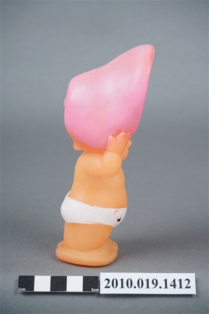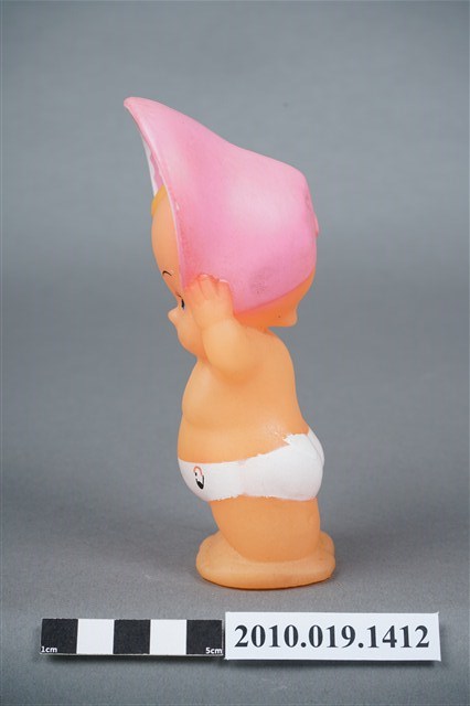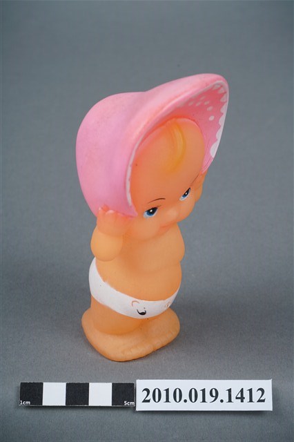 1.本物件為丘比娃娃,塑膠材質。玩偶臉部有著長睫毛,眼睛有白、黑與藍色顏料塗裝,頭戴粉紅色圓帽,帽子內側有白色圓點,著白色尿布。玩偶底部有一圓形孔洞,本物件表面上有許多髒污。2.丘比娃娃在1909年由美國插畫家Rose O'Neill,參考愛神Cupid所畫的娃娃,1912年由德國廠商加以實體化,為丘比娃娃的雛型,由於受到歡迎,1922年日本美乃滋大廠Kewpie將丘比娃娃訂為該公司的商標。