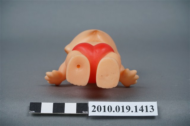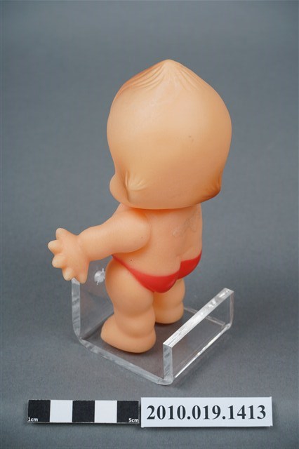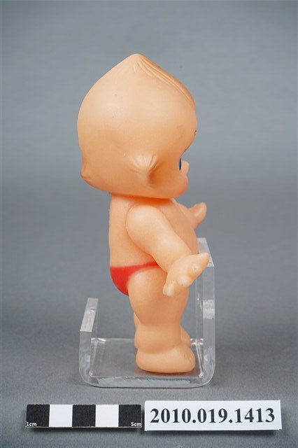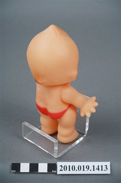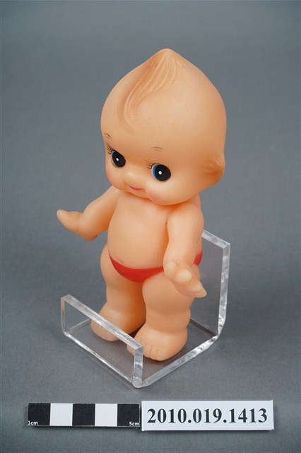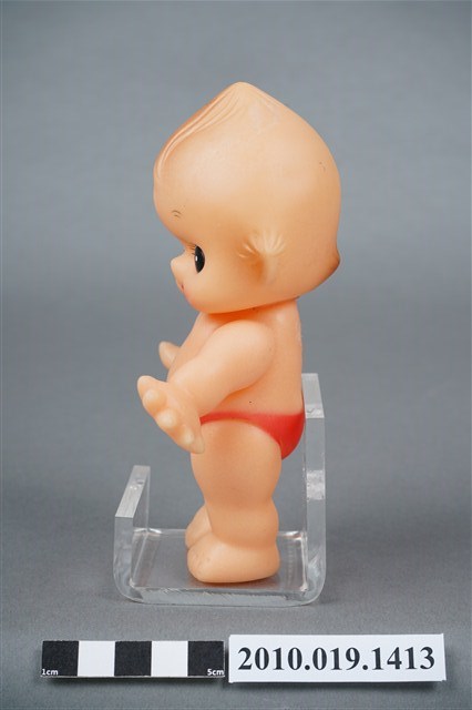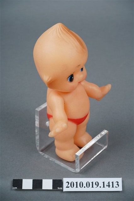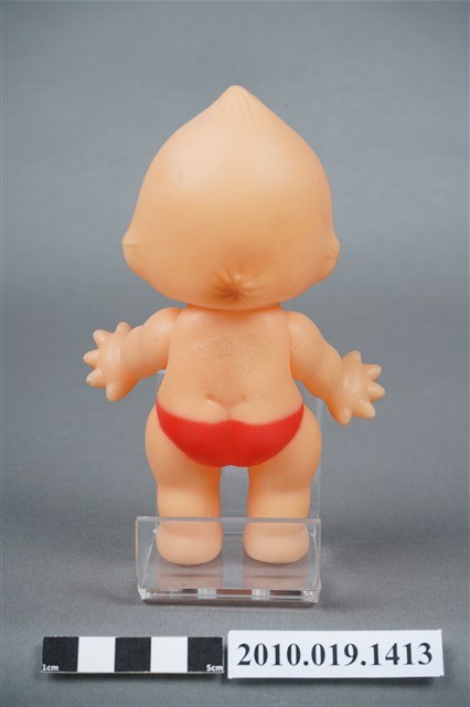 1.本物件為丘比娃娃,塑膠材質。玩偶臉部有著長睫毛,眼睛有白、黑與藍色顏料塗裝,頭頂、耳朵兩側以及後腦有凸出的頭髮,著紅色三角褲。玩偶左腳底部有一圓形孔洞,本物件表面上有許多髒污。2.丘比娃娃在1909年由美國插畫家Rose O'Neill,參考愛神Cupid所畫的娃娃,1912年由德國廠商加以實體化,為丘比娃娃的雛型,由於受到歡迎,1922年日本美乃滋大廠Kewpie將丘比娃娃訂為該公司的商標。