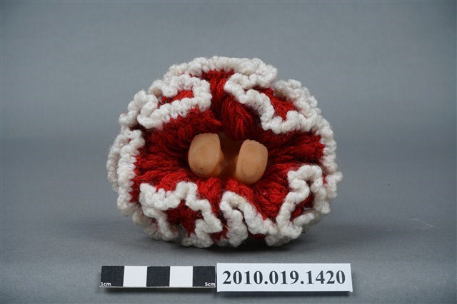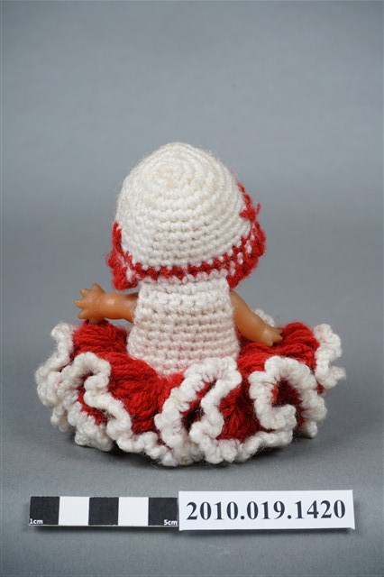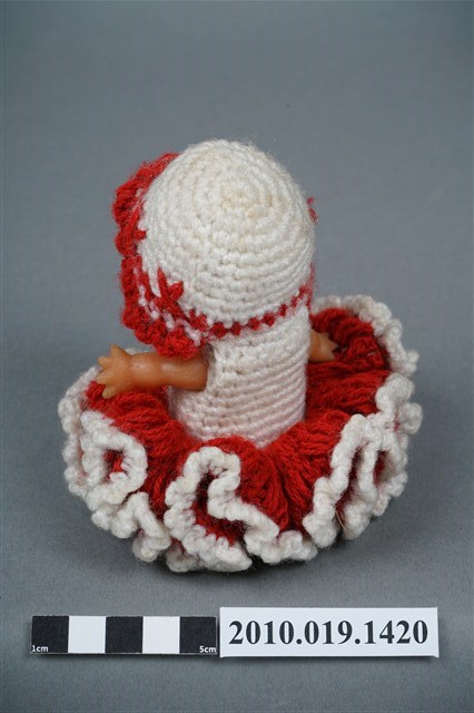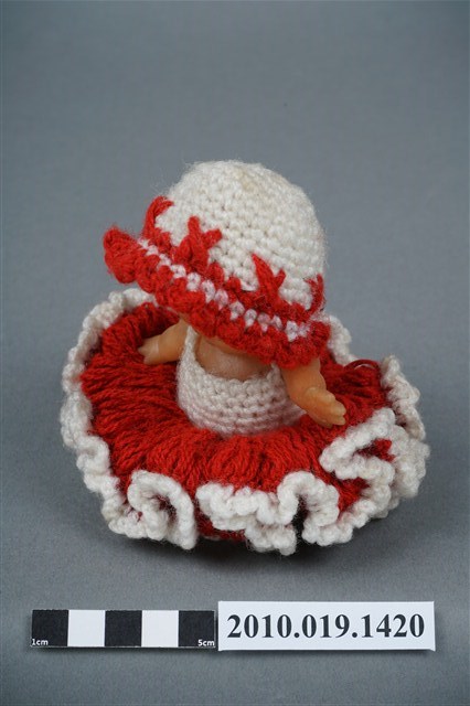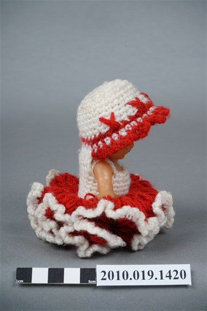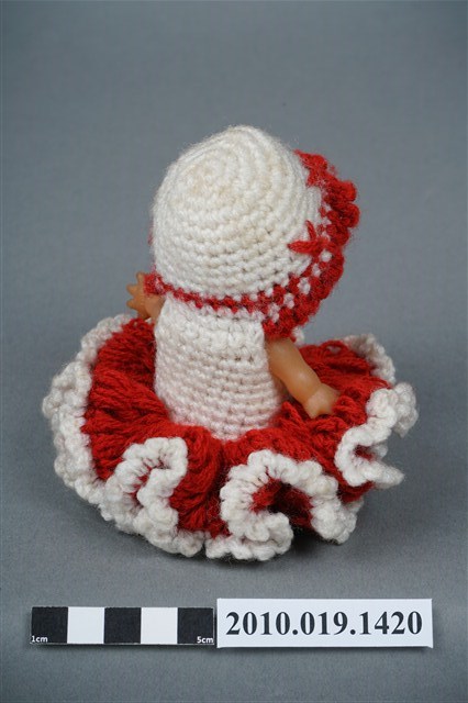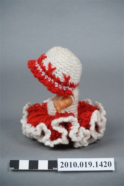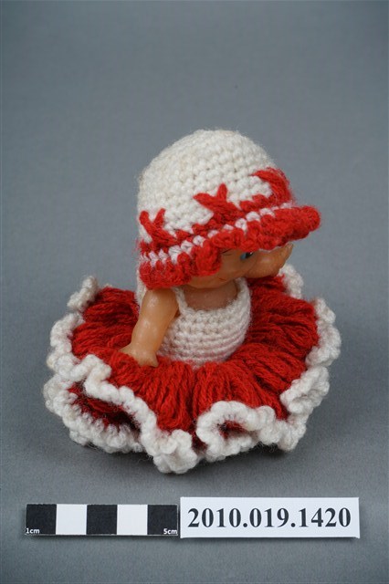 1.本物件為丘比娃娃,塑膠材質。玩偶臉部有著長睫毛,眼睛有白、黑與藍色顏料塗裝,頭戴白色毛線織成的帽子,邊緣為紅色毛線滾邊,其服裝材質亦同,為白色洋裝,下擺為紅色並以白色毛線滾邊。本物件表面上有許多髒污。2.丘比娃娃在1909年由美國插畫家Rose O'Neill,參考愛神Cupid所畫的娃娃,1912年由德國廠商加以實體化,為丘比娃娃的雛型,由於受到歡迎,1922年日本美乃滋大廠Kewpie將丘比娃娃訂為該公司的商標。