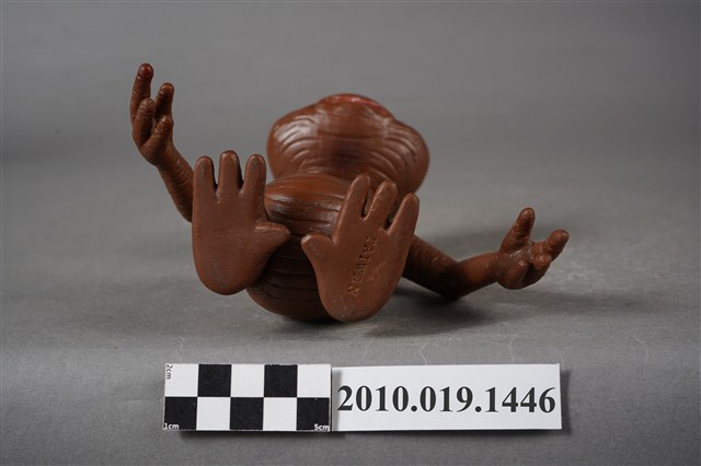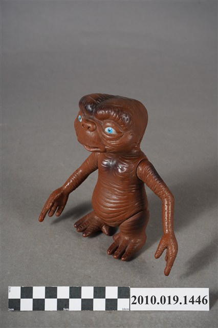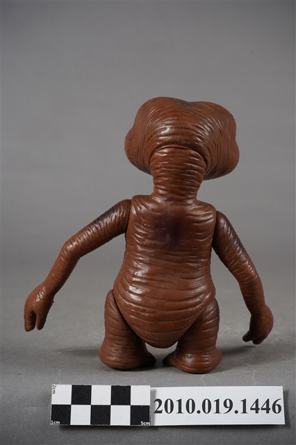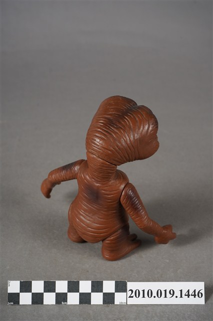 1.本物件為ET玩偶,塑膠材質。玩偶的臉部與身體呈現多處皺褶,手指與腳趾有明顯肥大樣態。玩偶底部有TAIWAN字樣,本物件表面上有許多髒污。