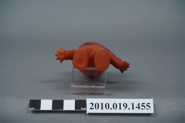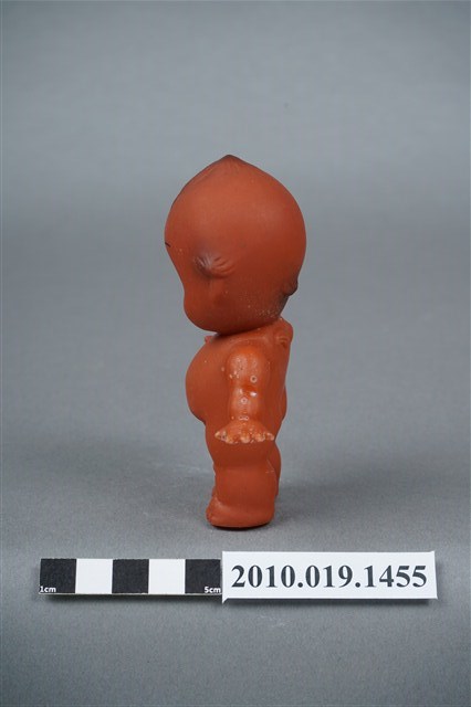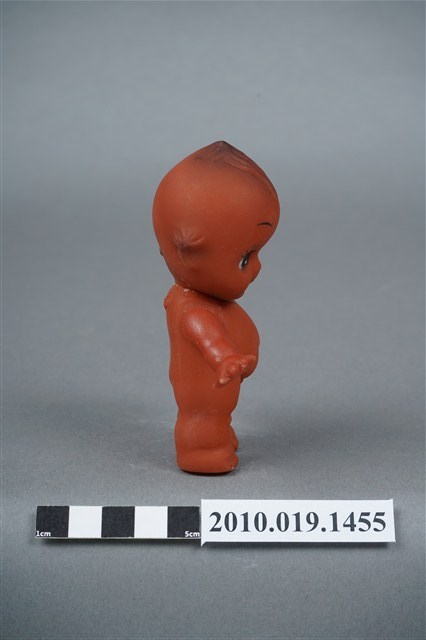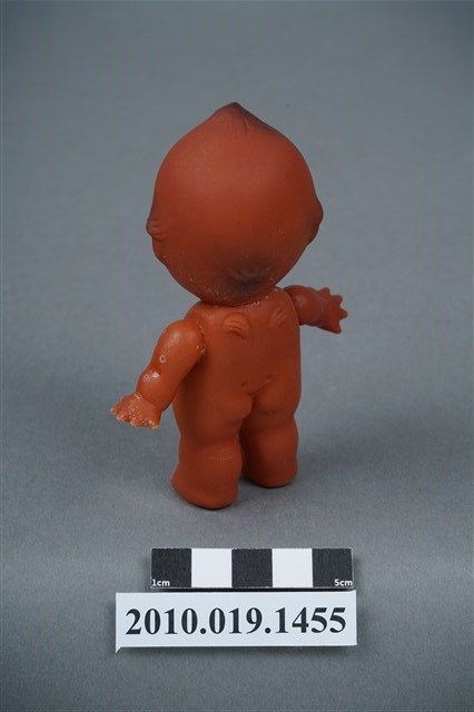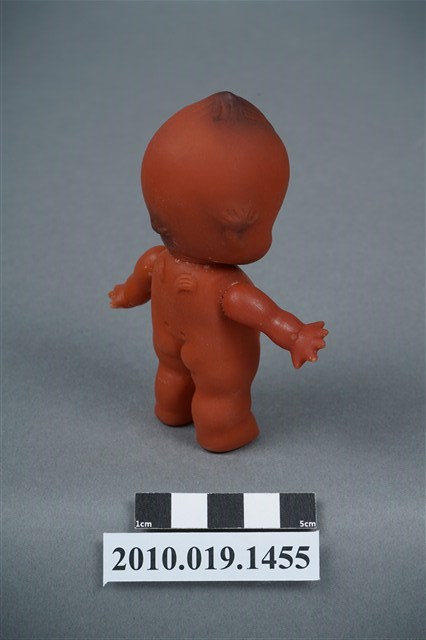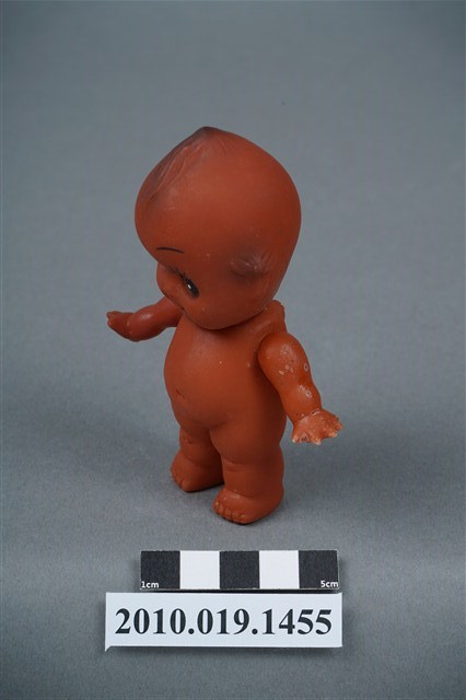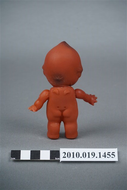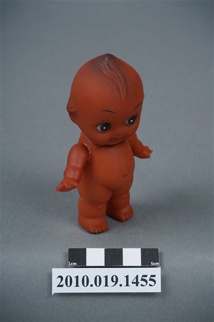 1.本物件為邱比娃娃,塑膠材質。玩偶顏色為咖啡色,臉部有著長睫毛,眼睛有白與黑色顏料塗裝,頭頂、耳朵兩側以及後腦有凸出的頭髮,背後有突出的小翅膀。本物件表面上有許多髒污。2.邱比娃娃在1909年由美國插畫家Rose O'Neill,參考愛神Cupid所畫的娃娃,1912年由德國廠商加以實體化,為邱比娃娃的雛型,由於受到歡迎,1922年日本美乃滋大廠Kewpie將邱比娃娃訂為該公司的商標。