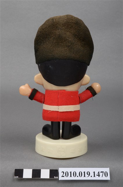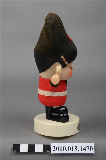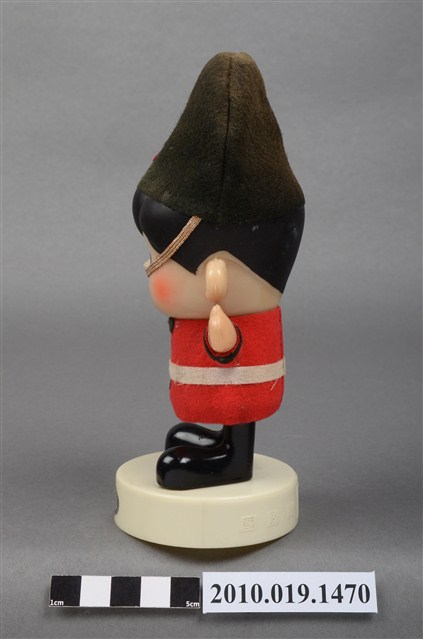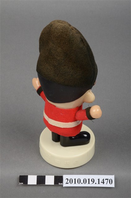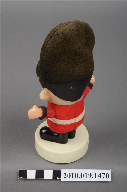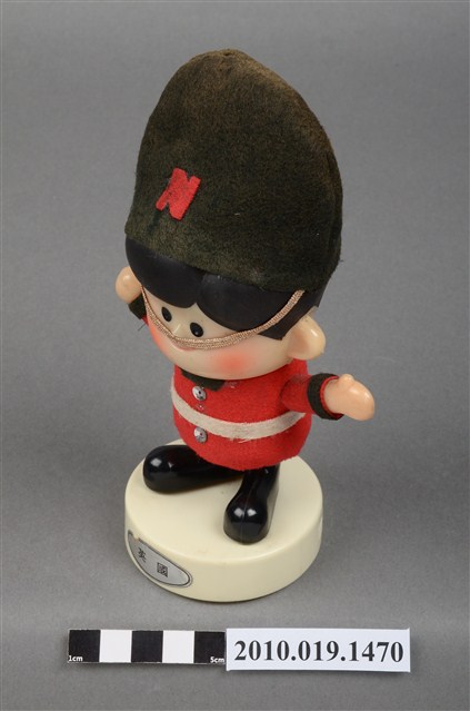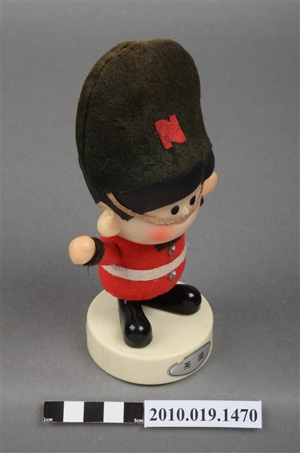 1.本物件為國際牌企業玩偶,塑膠材質。玩偶有著黑色頭髮,兩頰兩旁有橘紅色腮紅。其身穿紅色外衣及黑色長褲,頭戴黑色長帽,帽子有繫帶及N字樣,服裝樣式應是參照英國步兵衛隊制服。玩偶站在一圓形白色底座上,底座上貼有一英國字樣標籤紙。本物件表面上有許多髒污。