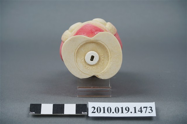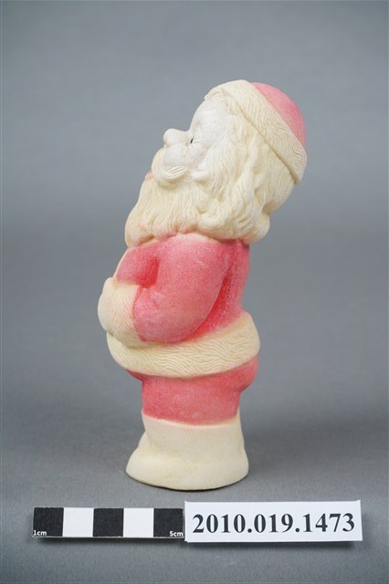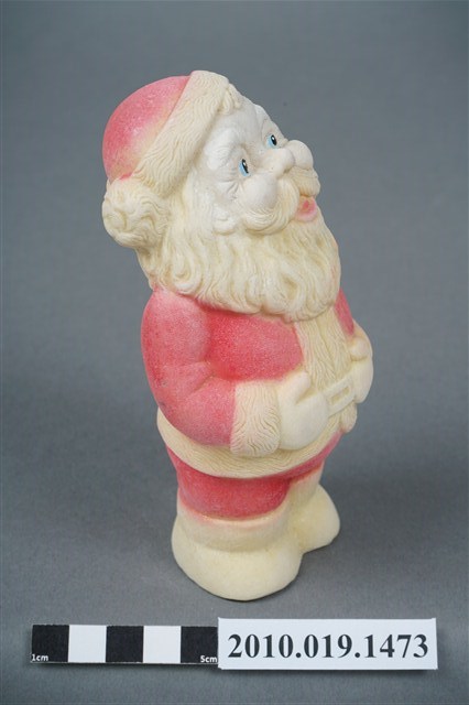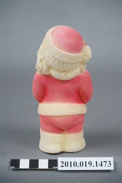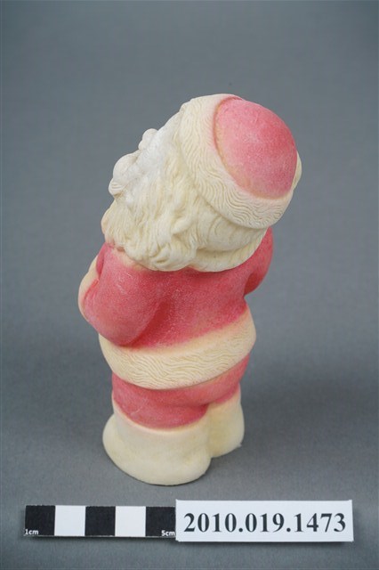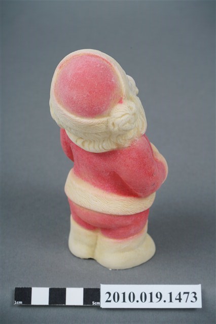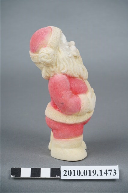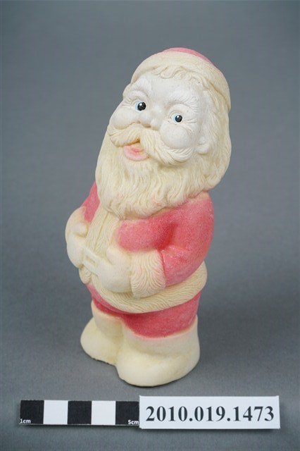 本物件為聖誕老公公玩偶,塑膠材質。玩偶顏色為白色,雙手置於腰帶前,眼睛有白、黑與藍色顏料塗裝,穿著紅色聖誕節服裝與帽子,邊緣處為白色滾邊。玩偶底部有一圓形裝置,裝置中間有一長方形孔洞,周邊有MADE IN TAIWAN字樣。本物件表面上有許多髒污。