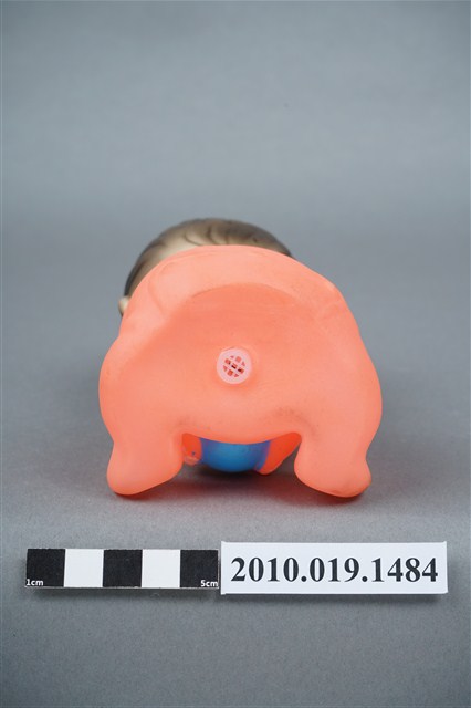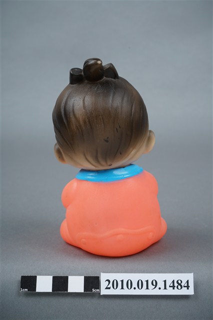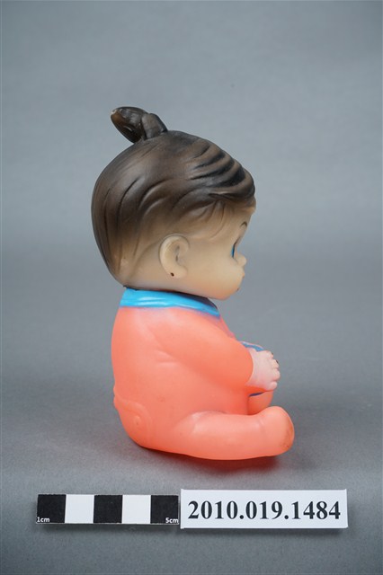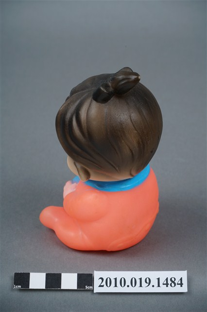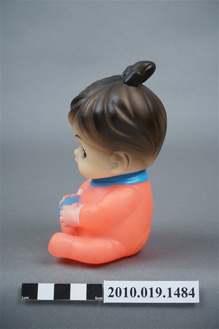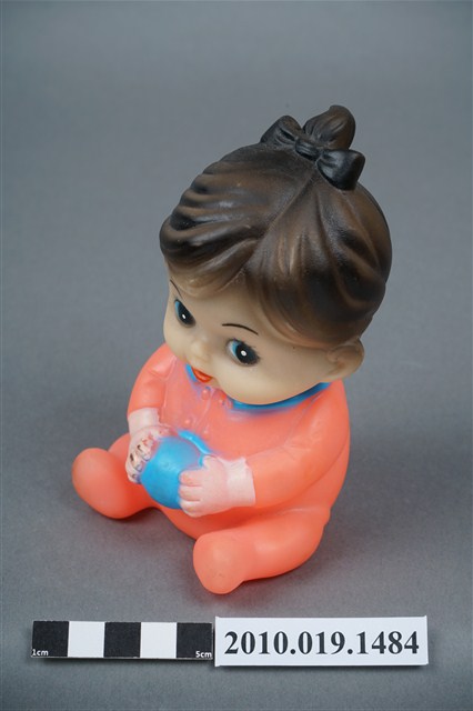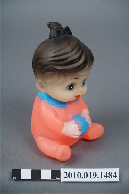 本物件為女嬰玩偶,塑膠材質,呈坐姿。玩偶臉部有著長睫毛,眼睛有白、黑與藍色顏料塗裝。玩偶身穿粉紅色連身嬰兒服,手持藍色小球。玩偶底部有一圓形網狀孔洞,本物件表面上有許多髒汙。