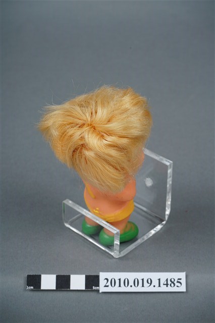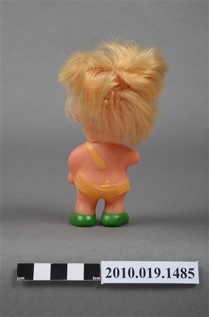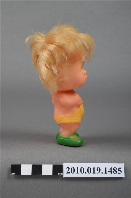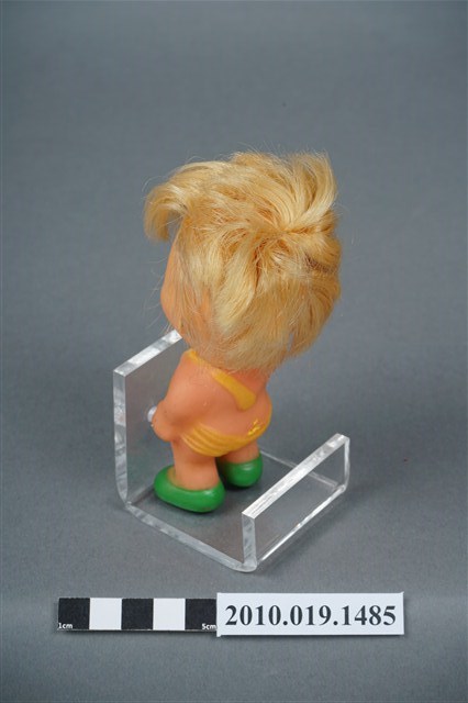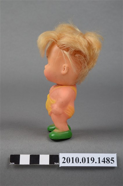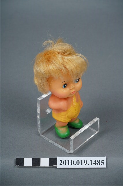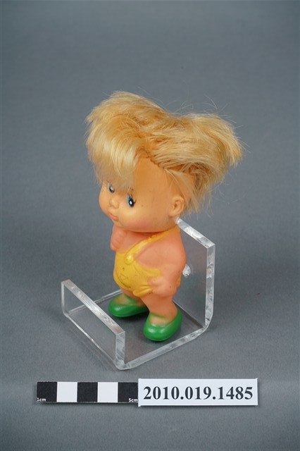 本物件為男孩玩偶,塑膠材質。玩偶臉部有著長睫毛,眼睛處有白、黑與藍色顏料塗裝。其身穿黃色吊帶服並搭配綠色鞋子。玩偶底部有一圓形孔洞,本物件表面上有許多髒汙。