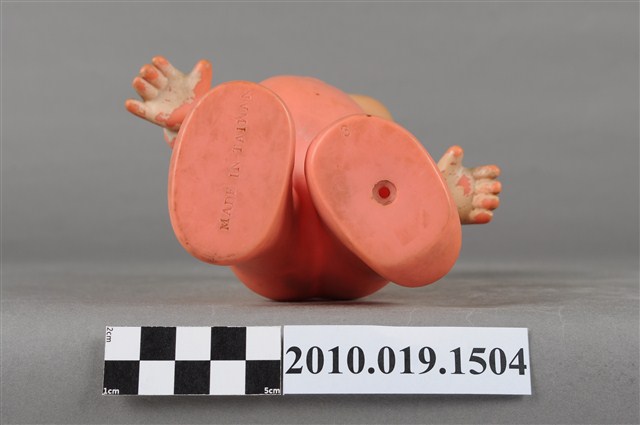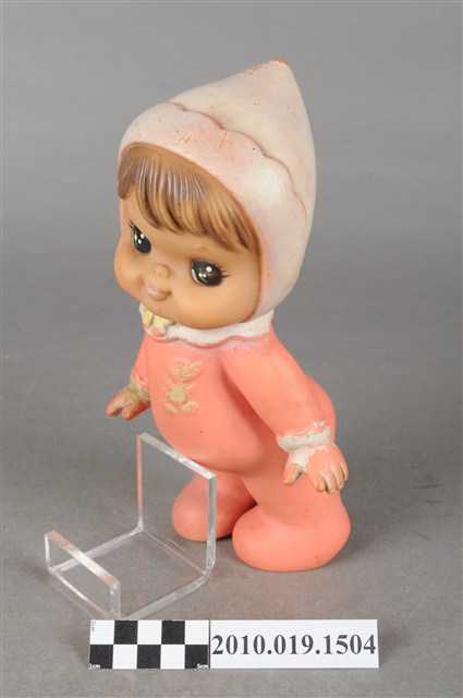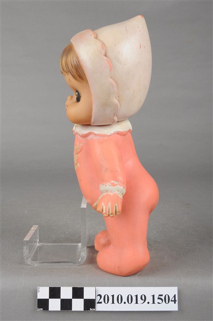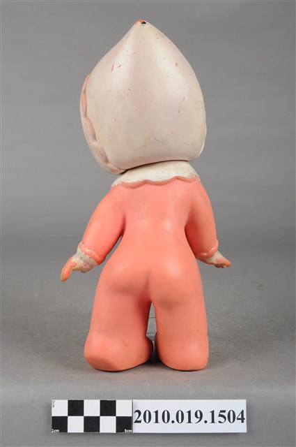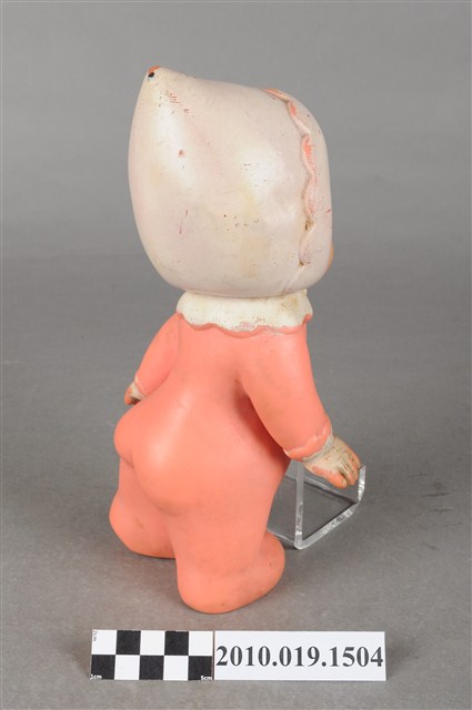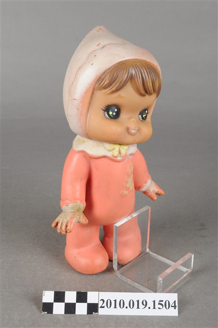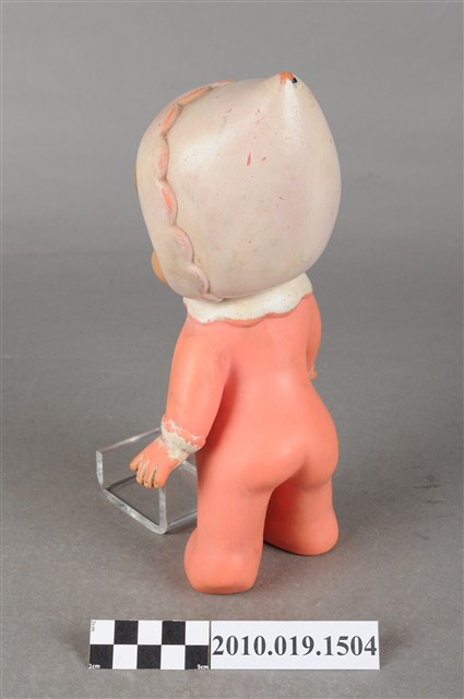 本物件為橘色嬰兒玩偶,玩偶頭戴白色花邊帽子,露出額頭咖啡色瀏海,淡眉大眼並有明顯睫毛,身著橘色連身褲子,脖子處有一條點綴花朵的領巾,胸口處有一隻鴨子圖案,雙手微張,底座上寫有「MADE IN TAIWAN」字樣,整個玩偶以站姿呈現,並且有些許斑駁污漬。