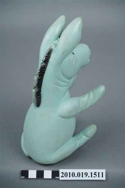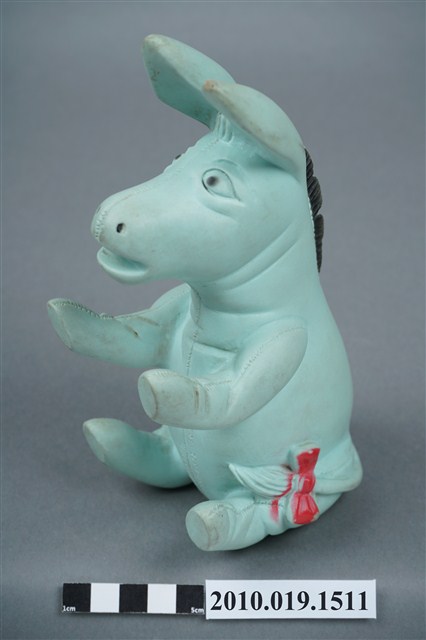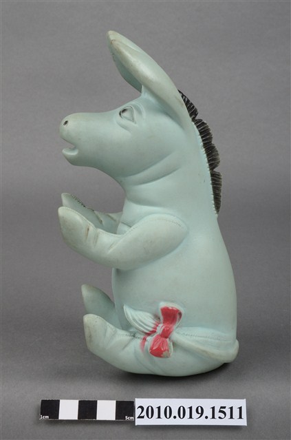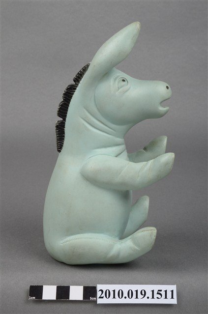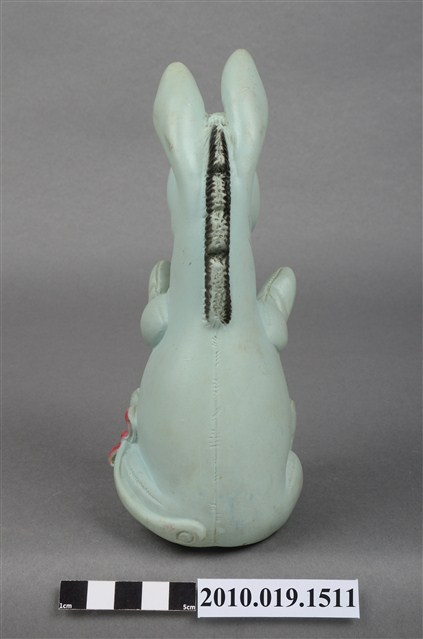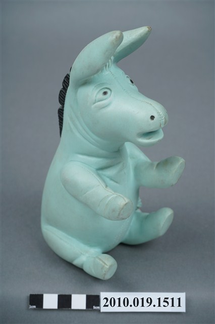 1.本物件為屹耳驢子玩偶,為藍綠色,驢子背上有黑色鬃毛,是迪士尼小熊維尼當中的角色「屹耳(Eeyore)」,尾巴末端並繫有一條紅色蝴蝶結,腹部的地方寫有「1966 WALT DISNEY」及「HOLLAND HALL」字樣,玩偶以坐姿呈現。