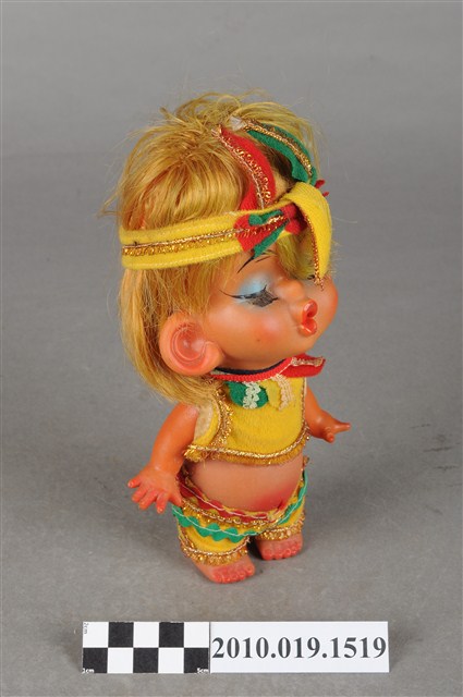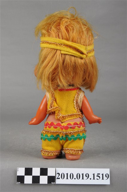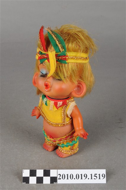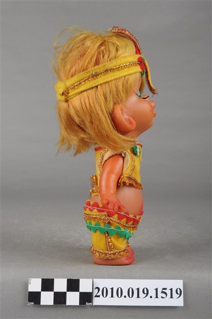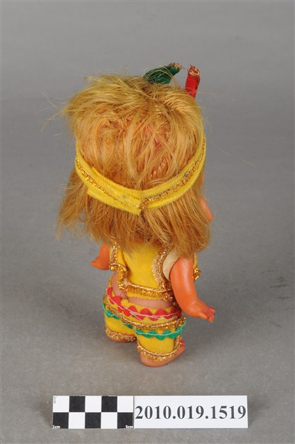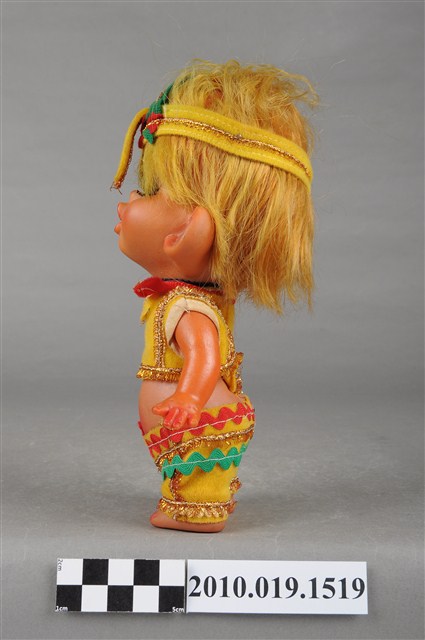 本物件為印地安造型玩偶,金色短髮,頭上戴黃色頭巾,中間處有紅綠相間造型,細眉眼睛閉上並上有藍色眼影,粉唇嘟起,身著黃色短上衣,上衣四周有金色線條滾邊,並在領口處有紅綠相間樣式,下身著同色系褲子,在腰際處同樣有紅綠線條裝飾,並有金色線條滾邊,上衣與褲子間露出肚子,雙手微張平放在兩側,整個物件保存良好。