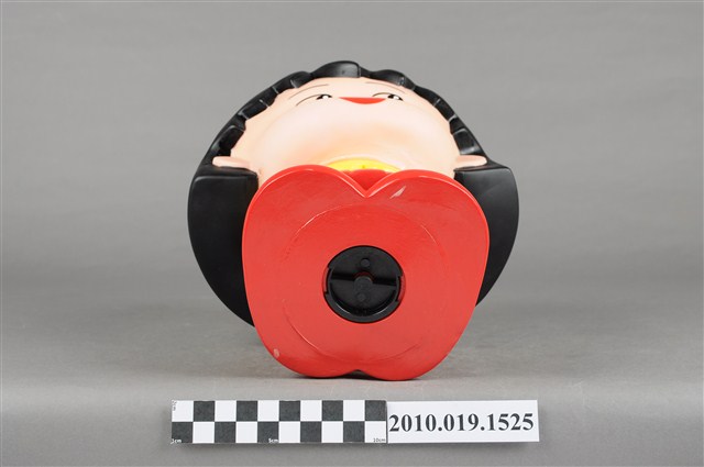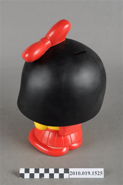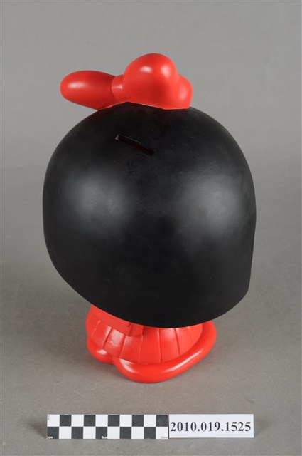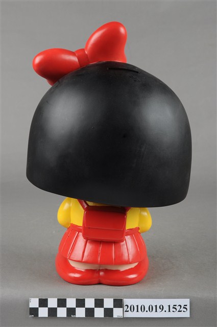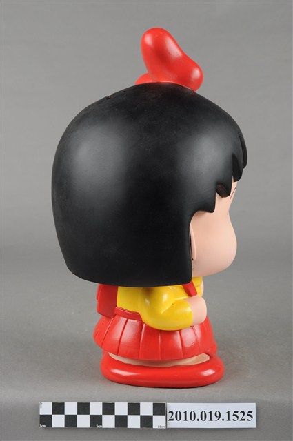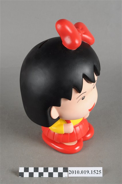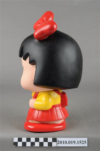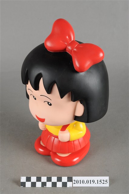 1.本物件為櫻桃小丸子造型存錢筒。頭戴紅色蝴蝶結,身穿黃色襯衫、紅色裙子,穿紅鞋,背紅色書包。