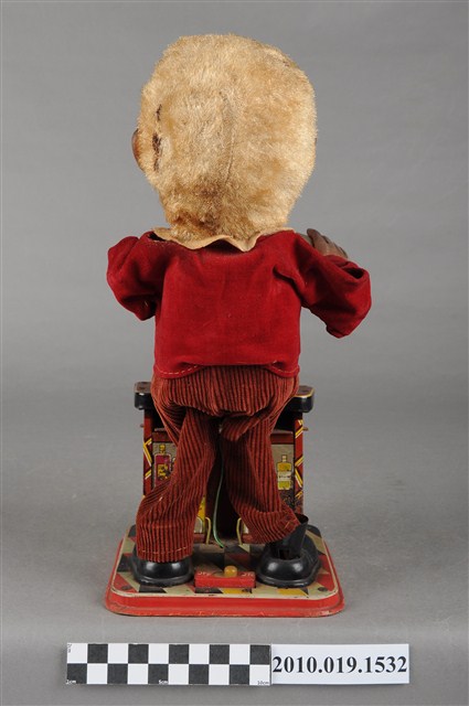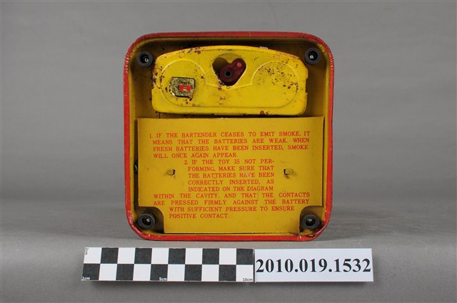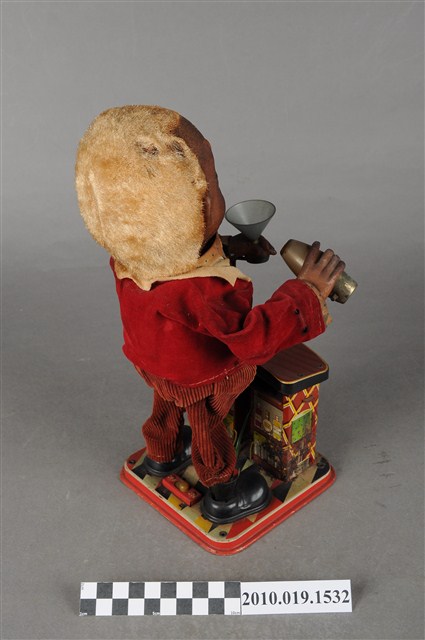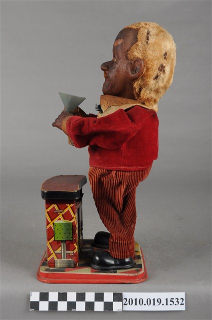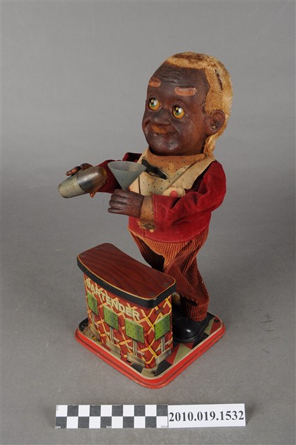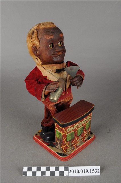 本物件為調酒酒保玩偶,咖啡色皮膚酒保有白色頭髮,濃眉大眼,身著紅色西裝翻邊外套,裡面著白色襯衫並有黑色領結,下身則著橘色呢絨褲,左手拿酒杯,右手則拿調酒器,站在吧檯前面,吧檯前方畫有3張圓形椅,並寫有「bartender」字樣,底盤部分以英文寫有操作方式,左上方並有一張標籤上面寫有「ROSKO TESTED」字樣,整個物件有些許斑駁與生鏽痕跡。