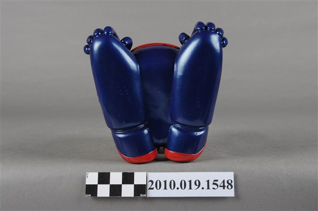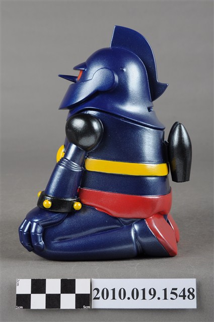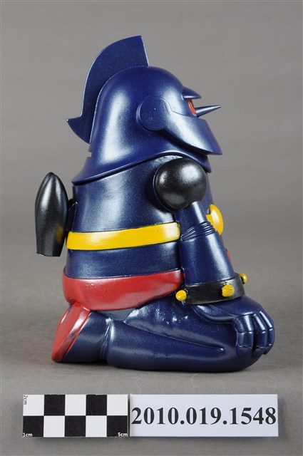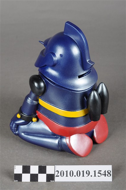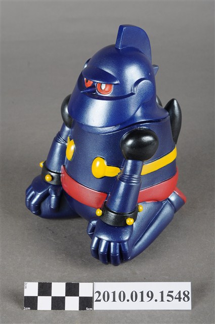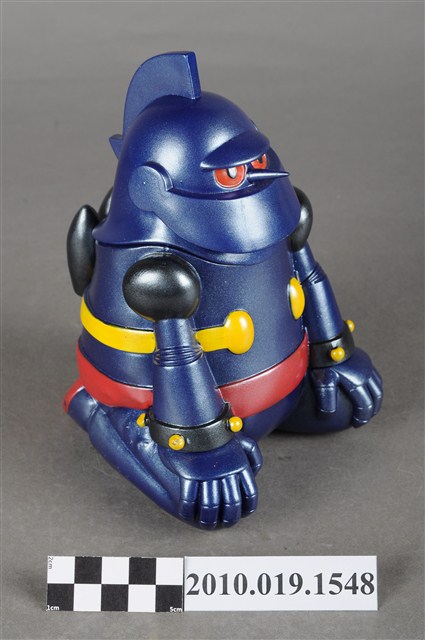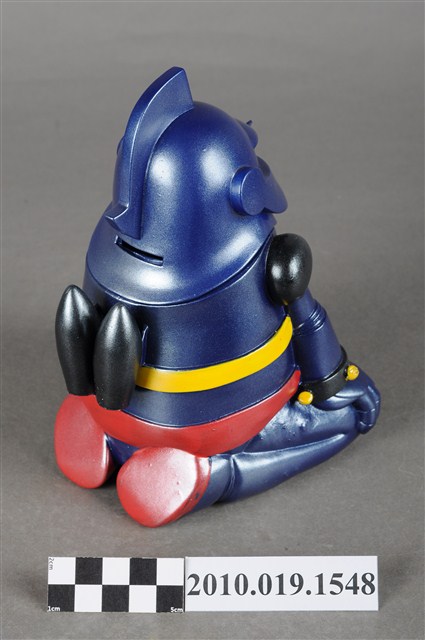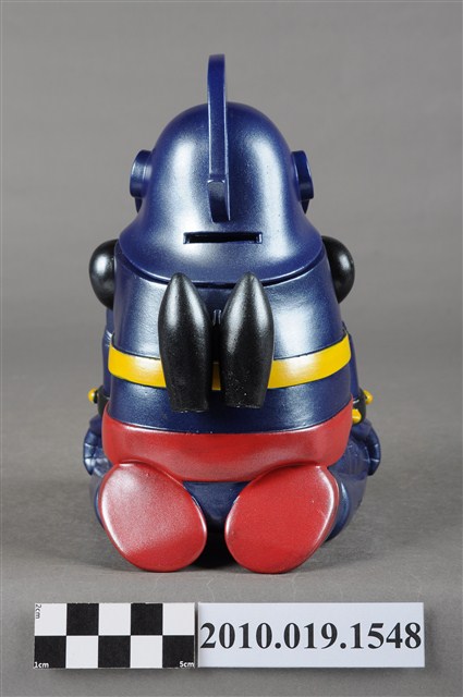 1.本物件為鐵人28號玩偶存錢筒,材質為塑膠,機器人整體顏色為藍色,有紅色眼睛,機器人雙手連接處為黑色,機身上有黃色及紅色部件,背後則有兩個黑色火箭,背後有投幣孔,可將硬幣投入存錢筒。