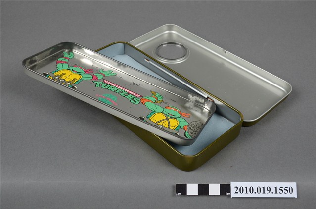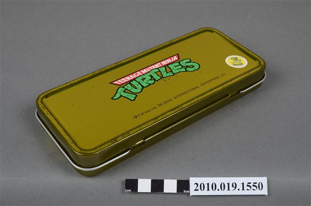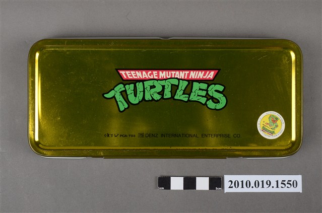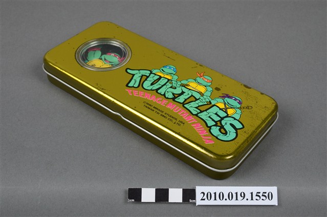 1.本物件為忍者龜金屬鉛筆盒,鉛筆盒為金色,正面左方有塑膠透明圈圈,裡面印有忍者龜成員─頭戴紅色眼罩的拉斐爾,旁邊依序為戴藍色眼罩的李奧納多、戴橘色眼罩的米開朗基羅及戴紫色眼罩的多納泰羅,所有成員肌肉立體明顯,下方並寫有「TURTLES」、「TEENAGE MUTANT NINJA」等字樣。