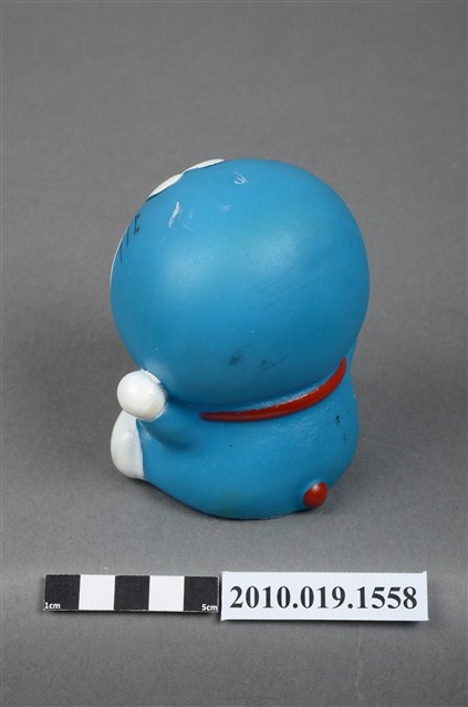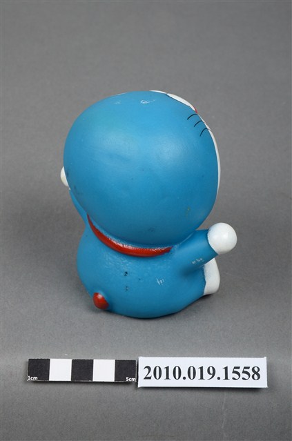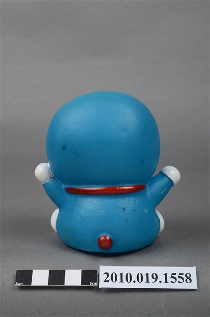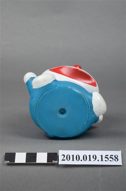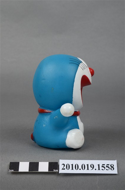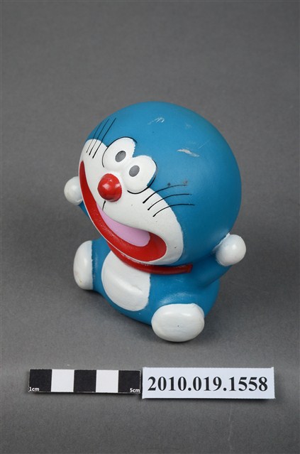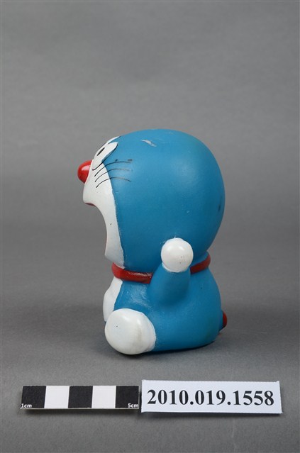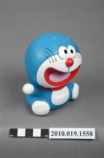 1.本物件為哆啦A夢玩偶,主體為藍色貓形機器人,身體顏色主要為藍色,臉、腹、手、腳則是白色,鼻子是紅色的,張嘴大笑並露出紅色嘴巴,兩頰上各有三根鬍鬚,領口有紅色項圈,雙手高舉以坐姿呈現。