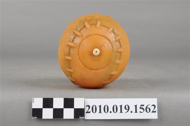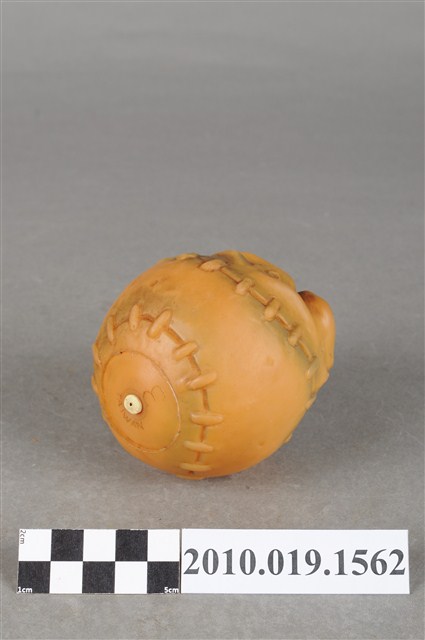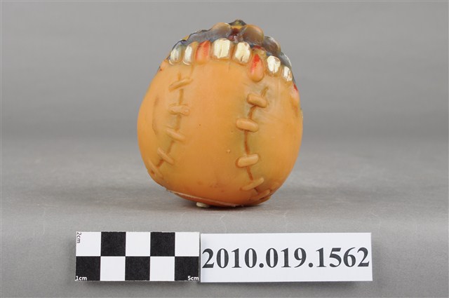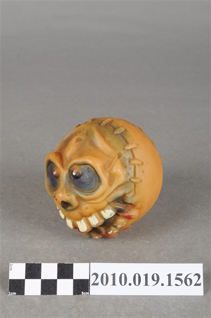 本物件為骷顱玩具球,為塑膠材質棒球樣式,主要為淡咖啡色,球的正面有兩顆黑色大眼睛,黑色大鼻孔,並張大嘴露出上下排不整齊的白色牙齒,整體造形看起來像骷顱造型有點可怕,整個物件有些斑駁痕跡。