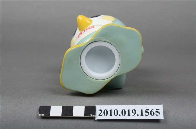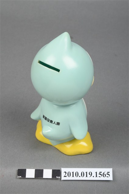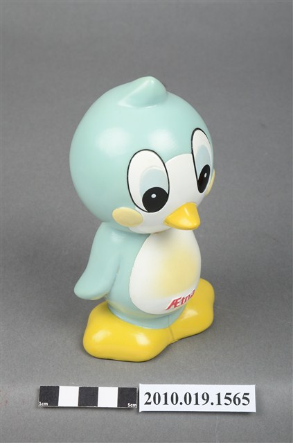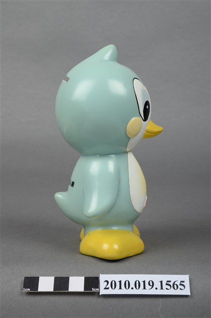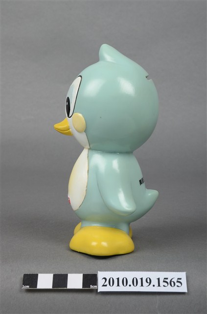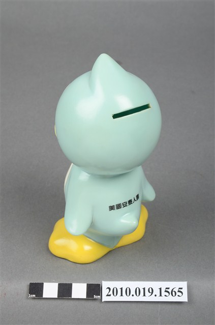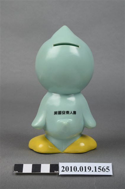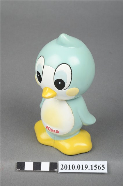 1.本物件為美國安泰人壽企鵝玩偶存錢筒,材質為塑膠。外型似粉藍色企鵝樣貌以擬人姿態站姿,臉部有雙大眼黃色嘴巴旁有嫩黃色腮紅,正面白色肚子印有紅色logo「AEtna」字樣,頭部後方有一長方形孔洞可投零錢,背部印有黑色「美國安泰人壽」字樣。底部中心有一白色圓形塞子,應為取出零錢處。