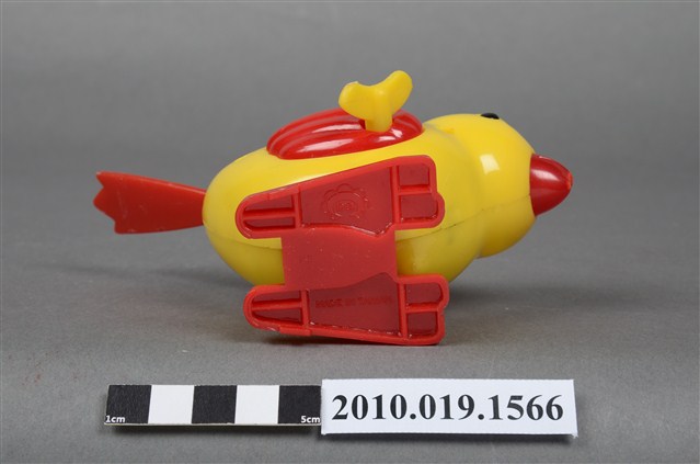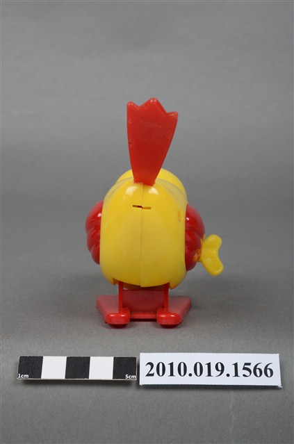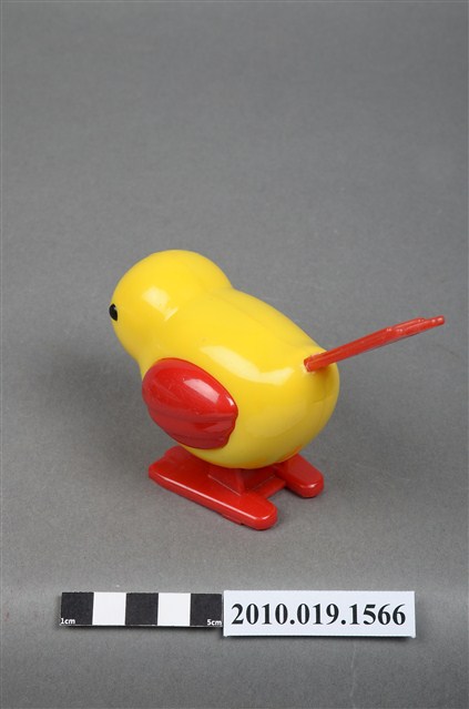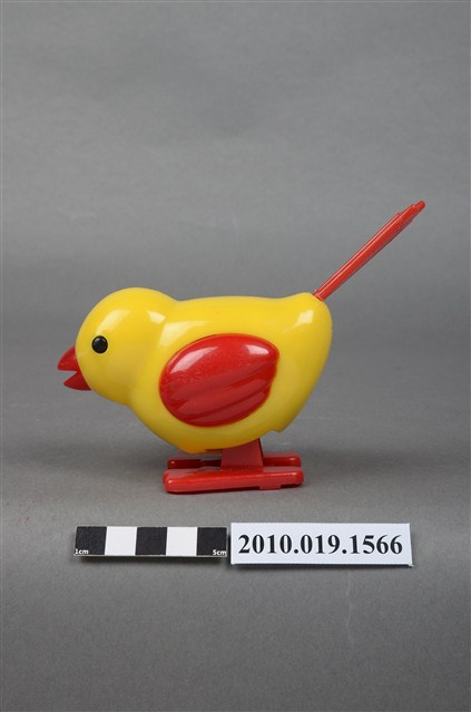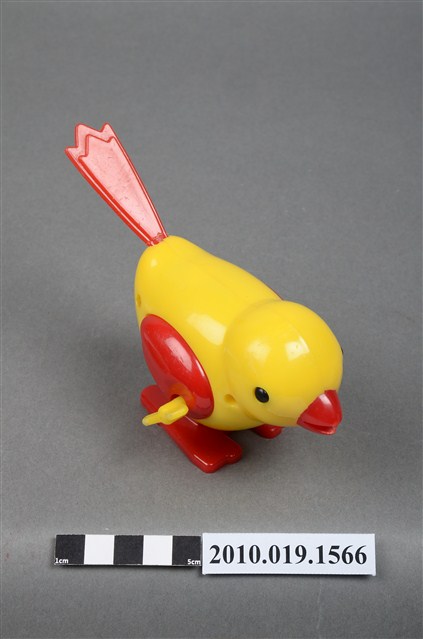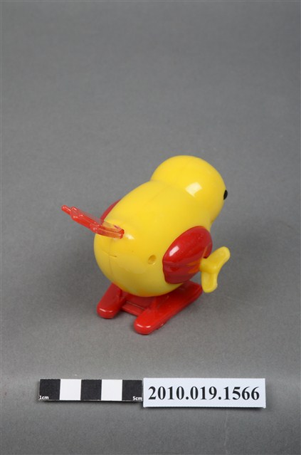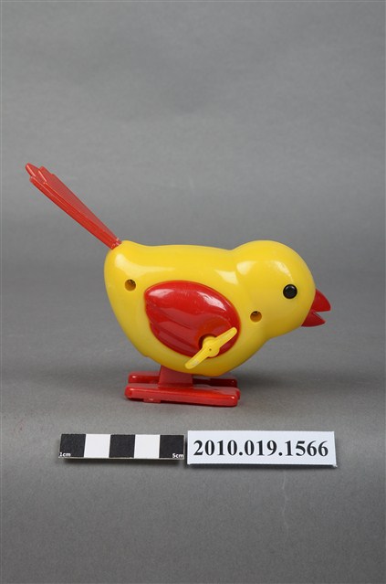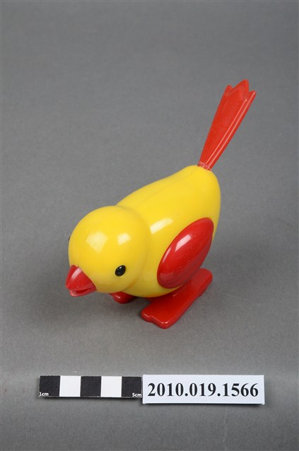 本物件為黃色小鳥發條玩具,主要造型為一隻黃色的小鳥,鳥的嘴巴、雙翅以及尾巴為紅色,雙腳連在一起亦為紅色,底盤上寫有「MADE IN TAIWAN」字樣,鳥的右側有黃色發條,可以轉動後使鳥移動,整個物件保存良好。