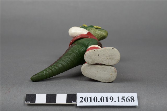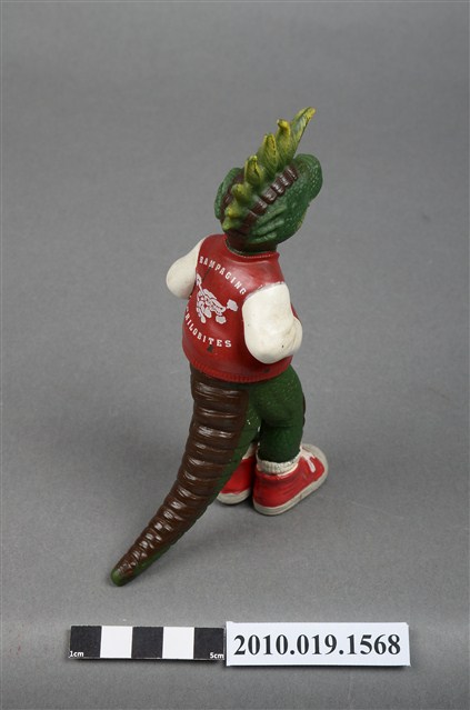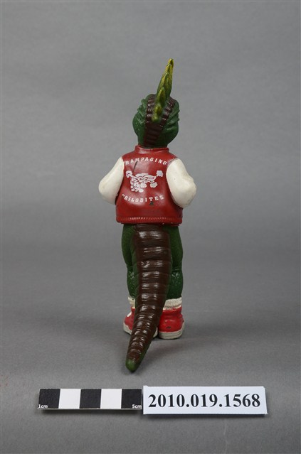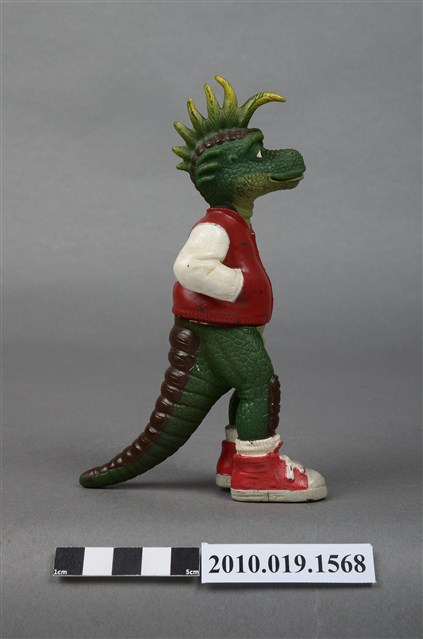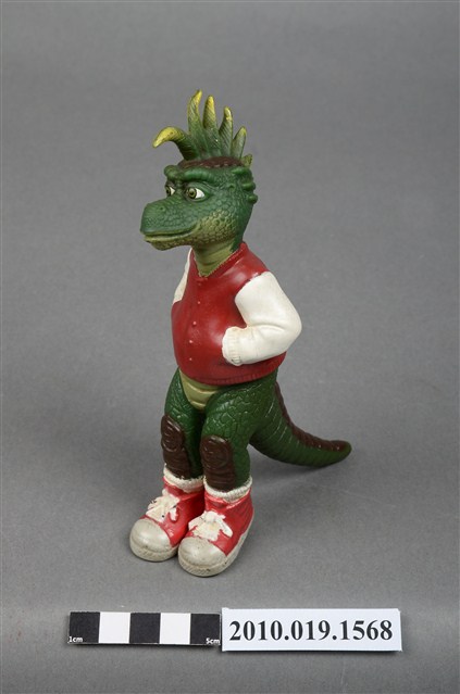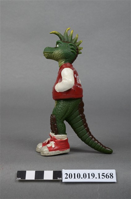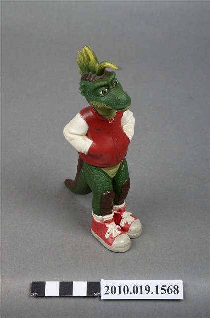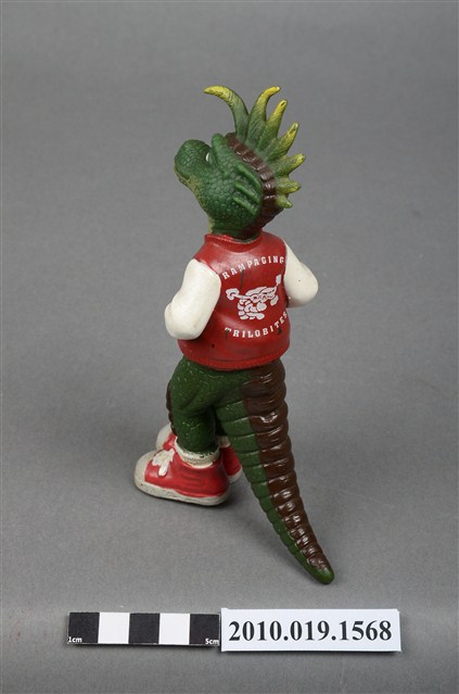 1.本物件為恐龍一族羅比辛克萊玩偶,主要為一隻綠色的恐龍,頭上有一個明顯的頭翼,大眼且大嘴微閉,身著紅白相間的棒球外套,中間並有5顆鈕扣,外套被面有寫有「RAMPAGING RILOBITES」字樣,中間並有白色圖案,雙手插於口袋內,下身著綠色與咖啡色相間的褲子,腳穿紅色綁帶鞋。