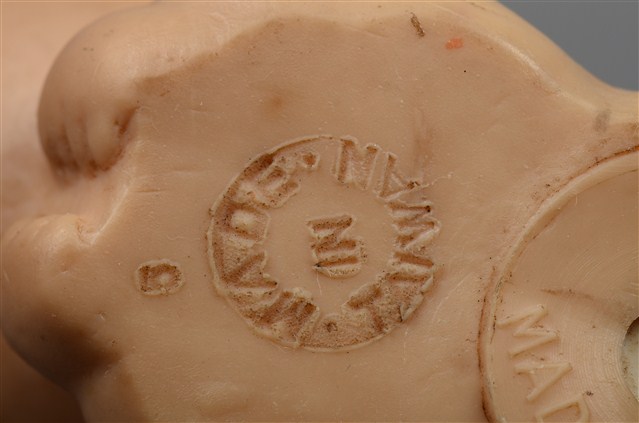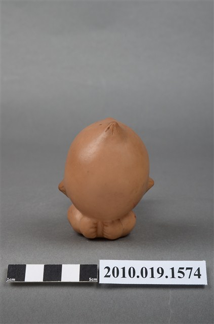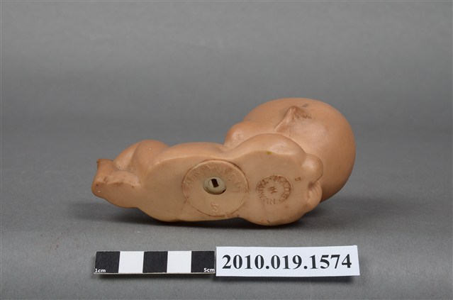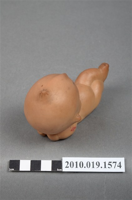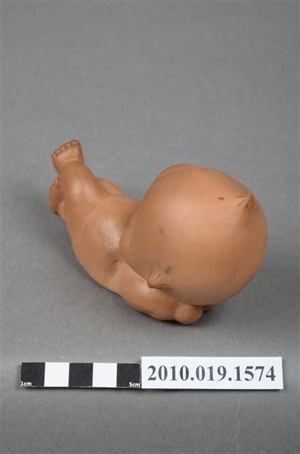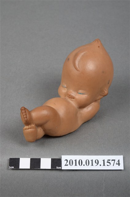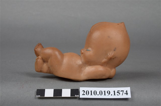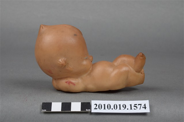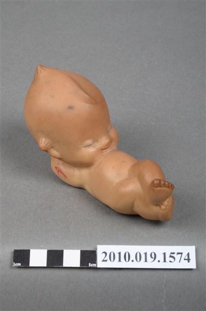 1.本物件為嬰兒丘比玩偶,玩偶未著衣服,以仰躺方式呈現,雙眼緊閉有藍色睫毛,雙手置於頭下,枕住頭,左腳跨於右腳上,腳底並寫有「MADE IN TAIWAN」字樣,整個物件有些許斑駁與泛黃。