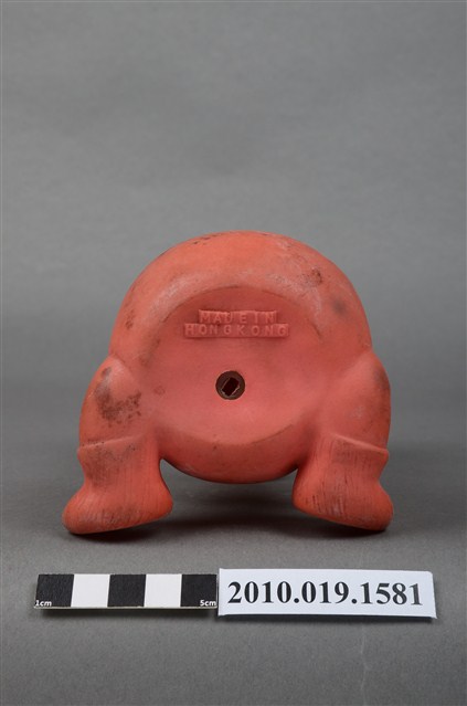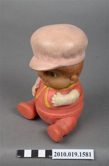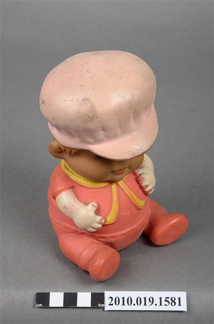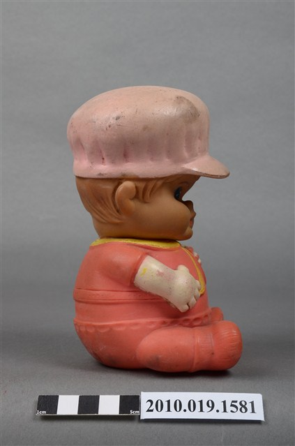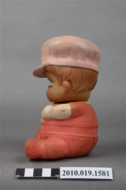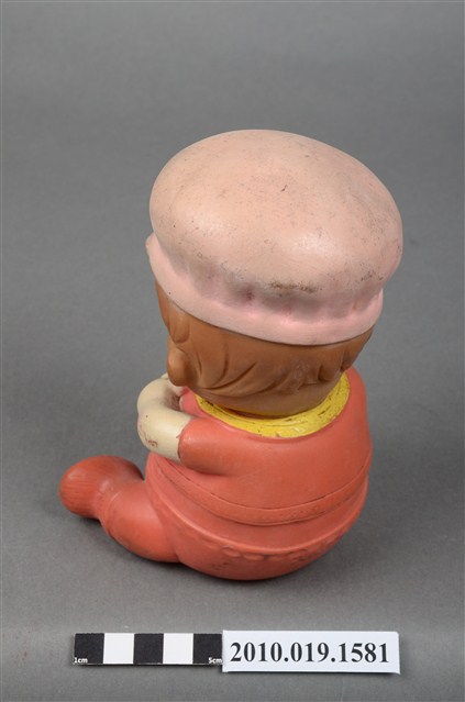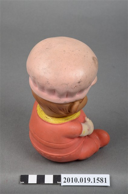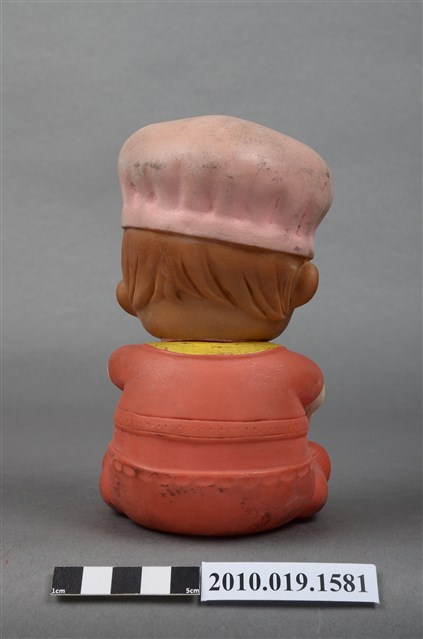 本物件為橘色戴帽玩偶,玩偶頭戴淺色系帽子,露出淺咖啡色瀏海,細眉大眼,粉唇微張,雙頰圓潤,身著橘色衣褲,外套上並有黃色線滾邊,以坐姿呈現,底座上並寫「MADE IN HONG KONG」字樣,整個物件有明顯斑駁與污漬痕跡。