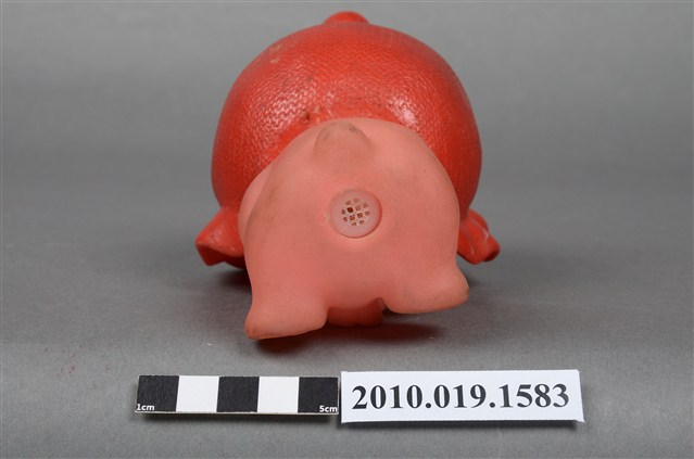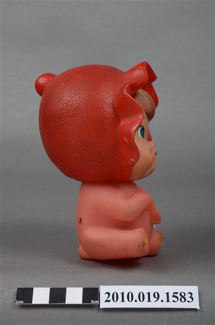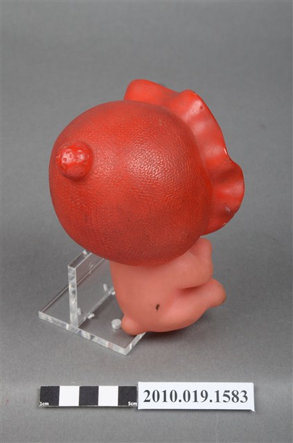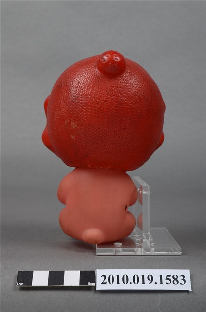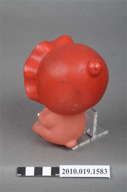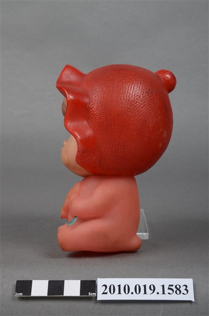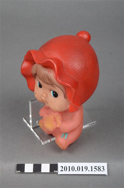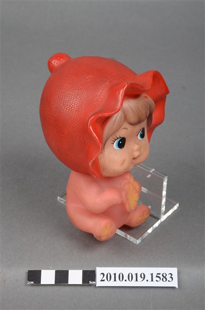 本物件為紅帽嬰兒玩偶,玩偶頭戴紅色花邊圓帽,露出淺咖啡色瀏海,細眉大眼,粉唇微張,雙頰圓潤,身體為橘色,雙手拿兩朵花,腳上未著鞋並露出腳掌,以坐姿呈現,整個物件保存不錯,僅有些微褪色與污漬。