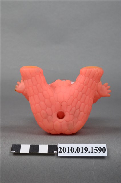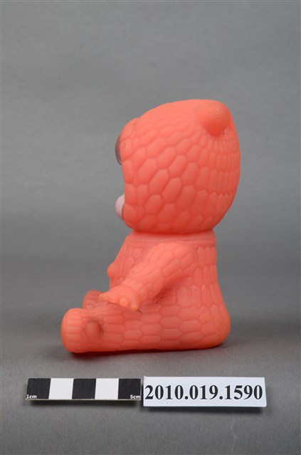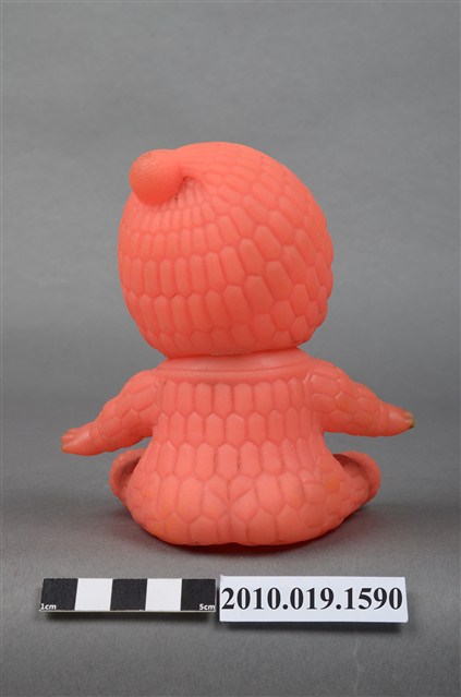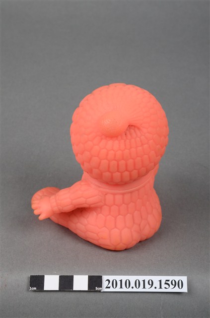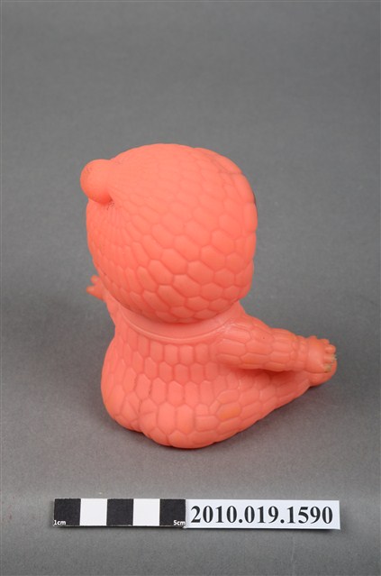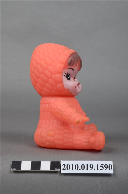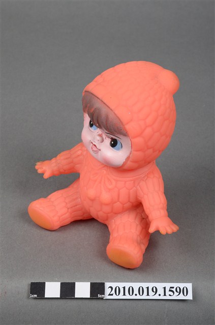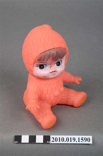 本物件為粉橘色嬰兒玩偶,塑膠材質一體成型,玩偶頭戴同色系毛帽,露出咖啡色瀏海,細眉大眼,紅唇微張,身著同色系毛衣,並且在脖子處有一條蝴蝶結綁帶,玩偶以坐姿呈現,整個物件保存尚可,唯臉上有些許污漬與毀損。